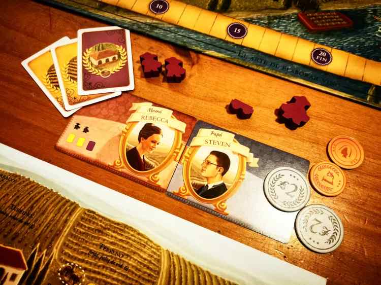 Tal vez la extensa y mecánica descripción que te hice pueda sonar algo esteril, como la de tantos otros juegos de este género, sin embargo, hay ciertas sutilezas que lo hacen destacar. Para empezar es un tema bien elegido, evocativo y representado de buena forma. Estás en la campiña de la Toscana italiana premoderna. El sol baja cálido y manso mientras llega el aroma del mediterraneo. Contemplas los verdes campos que se extienden frondosos, trabajados por productores vestidos en lino blanco. En estas tierras, tus padres te han heredado un modesto viñedo. Allí, con una pequeña porción de tierra, una cuadrilla de trabajadores, algo de dinero y tal vez algo de infraestructura o algún contacto útil deberás llevar adelante el sueño de ser la bodega de mayor renombre de Italia. Solamente un fundamentalista de Dungeons and Dragons le podría decir que no a eso, El atractivo es innegable, especialmente en un lugar como Uruguay donde se aprecia el vino y la cultura enológica se ha extendido en los últimos años. Por otro lado, el tema tiene un muy buen diálogo con el desarrollo del juego. Yo jamás produje vino en mi vida y no pretendo saber del tema, pero si te digo que para un jugador promedio todo resulta bastante intuitivo por esta razón. Vas a plantar, cosechar y producir vino para luego venderlo. Esta guía intuitiva ya te dice lo básico en la cadena de acciones. Por esta razón estoy convencido que es un juego que fácilmente se puede introducir a alguien que no esté en esto de los juegos de mesa, siempre y cuando esté dispuesto a invertir la atención necesaria. El tercer factor que quiero destacar puede ser polémico. Para muchos, la variabilidad que incorpora el azar de las cartas de visitante no corresponde con un juego largo y estratégico como este. Otros, como yo, aprecian la variabilidad, emoción y narrativa que aportan. La cadencia del juego es impecable, y el ritmo se intensifica a medida que avanza la partida. El comienzo es relajado y una acción bloqueada solo abre una posibilidad nueva, un camino diferente para conseguir puntos. Sin embargo, la tensión aumenta sobre el final cuando el plan está trazado y se necesita ese punto extra para vencer. Si bien el tablero escala bien, dado que aumenta la cantidad de puestos para trabajadores, el juego a más de cuatro jugadores se puede volver tedioso sin aportar mucho, pero más allá de eso y el hecho flagrante del azar, dado los mazos de cartas, no hay mucho que yo le pueda reprochar. Tal vez, en algún punto del juego, vas a sentir que que tenés menos opciones de las que te gustaría, pero esa falencia viene a ser cubierta por la que yo creo es una expansión imprescindible.