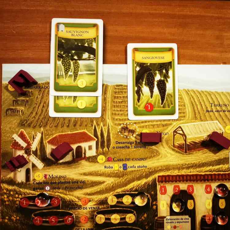 Una vez terminada la primavera, los jugadores irán colocando uno a uno los trabajadores que deseen para las acciones de verano en el tablero principal en el orden establecido en la estación previa. Tené en cuenta que los trabajadores asignados a estas tareas no se recuperan hasta fin de año, por lo que si planeas hacer algunas de las acciones disponibles en estaciones venideras debes guardar alguno para después. Durante la temporada estival podes ganar algo de dinero haciendo tours por el viñedo o vendiendo alguno de tus terrenos. Con la plata podes construir nuevas infraestructuras. Algunas te permiten plantar tipos de uvas más exclusivas y delicadas, otras te pueden bonificar con puntos al hacer ciertas acciones, proporcionarte un espacio propio para colocar trabajadores que siempre tendremos disponible y mejorar tu capacidad de albergar visitantes. Ampliar la bodega, es sin duda , de las más importantes mejoras. Ahí vas a producir vinos de mejor calidad e incorporar nuevos tipos, como el rosado y el espumoso, claves para atender pedidos más exigentes. También durante esta estación vas a poder comenzar tu producción de vinos. Por un lado consiguiendo cartas de vides y por otro plantar en tus terrenos. Estas vides pueden proveer uvas rojas y blancas de diferentes niveles. Para plantarlas vamos a precisar un lugar en el terreno pero tené en cuenta que el espacio es limitado. Como última opción podremos jugar una de las cartas de visitante. Básicamente, estas visitas te permiten hacer acciones puntuales más poderosas que las regulares o incluso te permiten obtener puntos cumpliendo ciertos criterios. La gran mayoría de ellas tiene que ver con las acciones de esta estación. Así, la visita de un arquitecto podría significarte una oportunidad de construir una estructura por menos costo del habitual, o tal vez un guía turístico pueda ser una oportunidad para ganar dinero extra durante los tours, o un horticultor se de maña para poder plantar una uva compleja sin las estructuras necesarias.