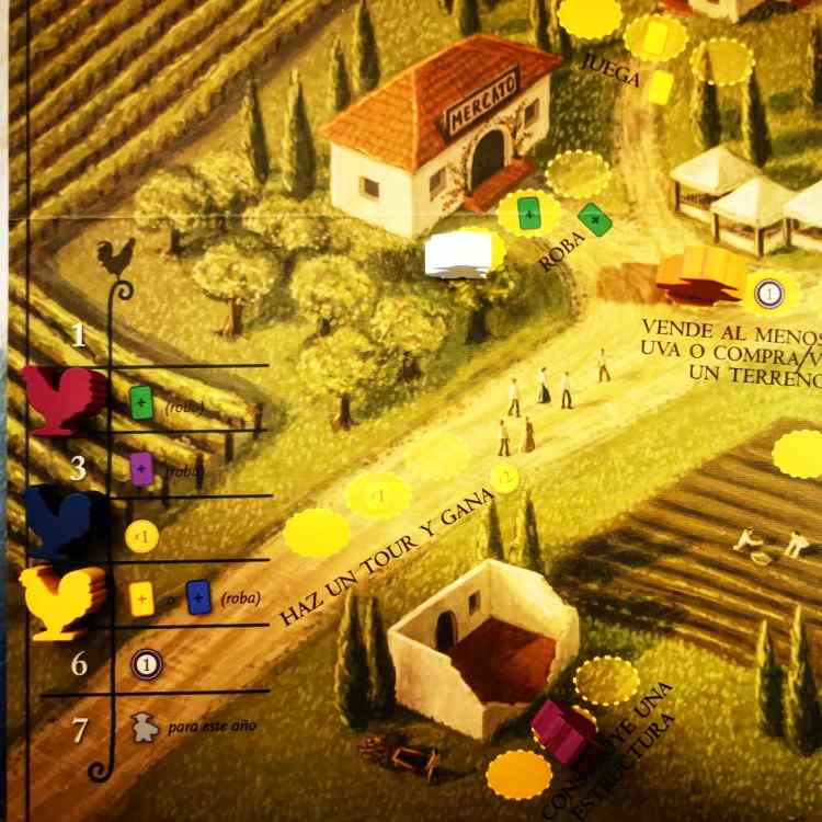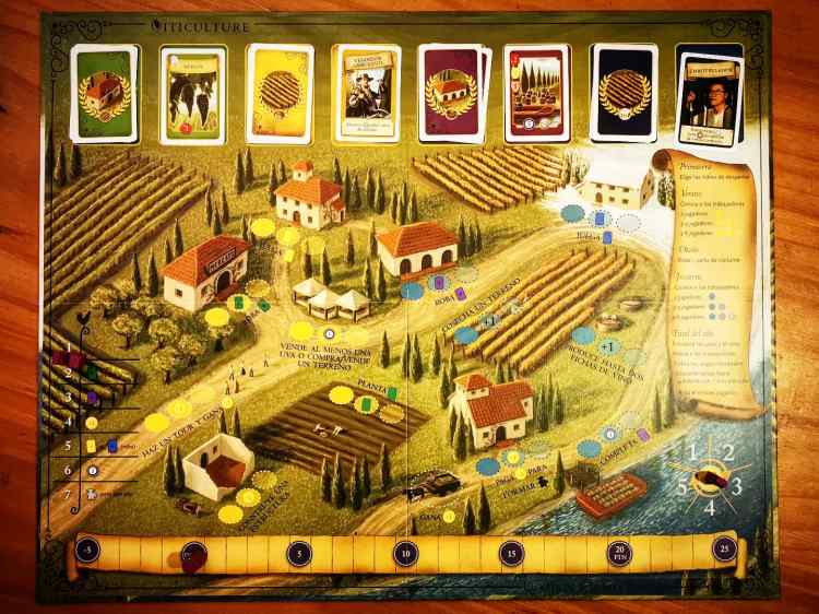 Cada año, o ronda en el juego, está dividido en estaciones y cada una de ellas nos ofrece el momento propicio para ciertas tareas. Para poder realizar una tarea debemos asignar a uno de nuestros trabajadores para que la lleve a cabo. Hay trece tareas posibles en el año y si tenemos en cuenta que comenzamos con tres trabajadores ya te vas dando cuenta que planificar con cuidado es sumamente importante, pero esta no es la única limitación. Cada acción tiene una cantidad de lugares disponibles para asignar trabajadores en el tablero dependiendo de la cantidad de jugadores. Jugando a dos, por ejemplo, sólo tendremos un espacio disponible, lo que significa que el que llegue primero bloqueará a otro la posibilidad de hacer la misma tarea. Una excepción a esta regla, así como una de las características diferentes de Viticulture, es el capataz, o trabajador grande. Esta figura es muy importante ya que es la que puede realizar una tarea sin importar si el lugar ya está ocupado, así que hay que reservarlo para el momento clave. Como te imaginarás, el orden de turno entonces es sumamente importante y por ello es variable ronda a ronda.