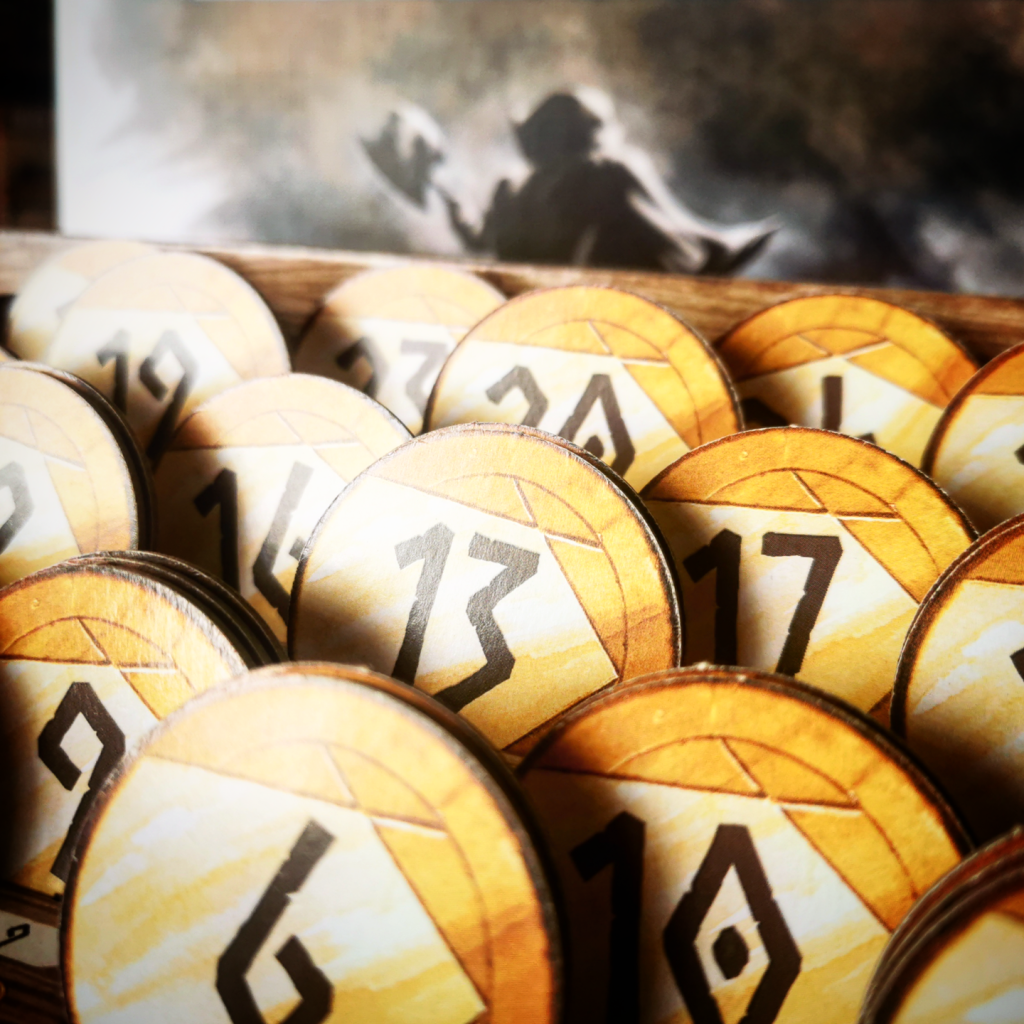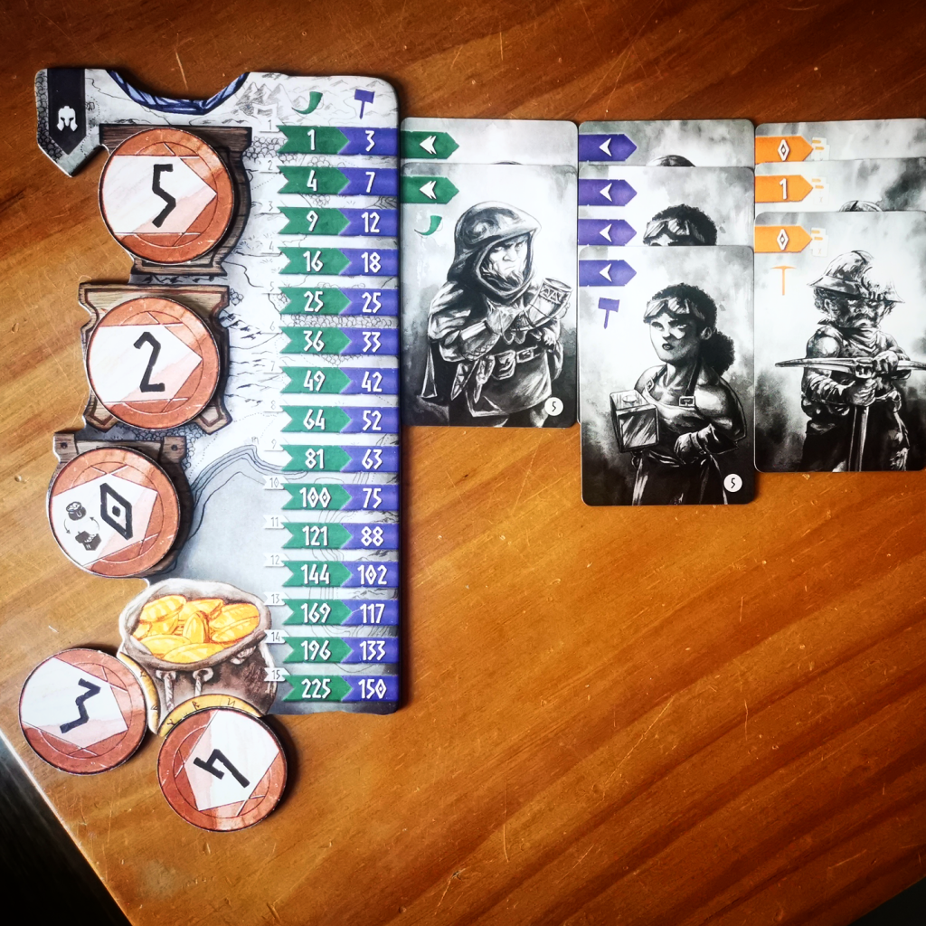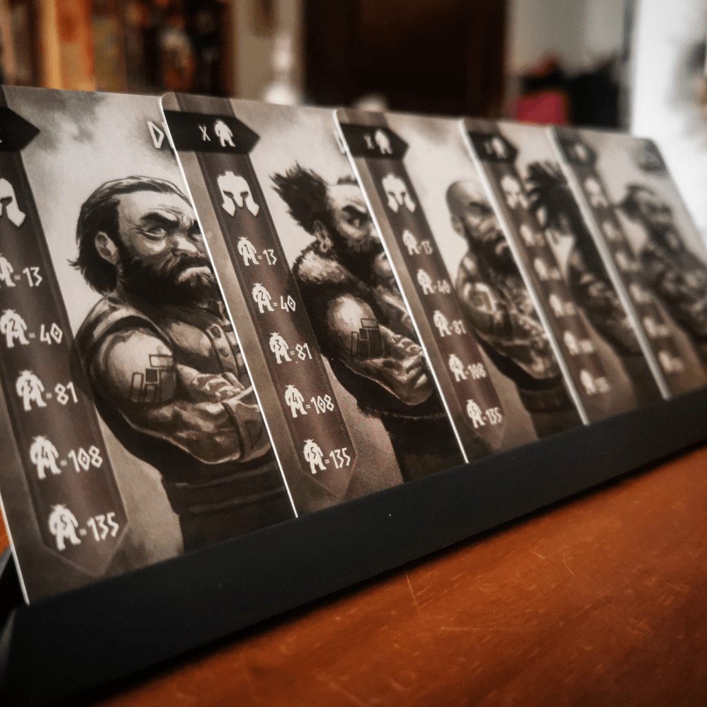 En algunos aspectos, la apariencia de Nidavellir es poco convencional. Antes que nada vale resaltar que estamos básicamente ante un juego de cartas y contiene un prominente mazo. con ilustraciones a carbonilla de valientes y rudos enanos. Luego de ahí es donde la cosa se pone más rara. Montaremos una especie de estrado donde, al comienzo de la partida, colocaremos el segundo componente de peso del juego que son unas monedas de cartón de gran tamaño y distintas denominaciones entre cinco y veinticinco. Acompañando tenemos tres pequeños tableros que van en el centro de la mesa y un tablero personal para cada jugador. Como frutilla de la torta hay unos atriles que sirven para colocar ciertas cartas en una suerte de exposición. Sin duda que hay material acá que a priori parece superfluo. Muchos juegos agregan cosas absolutamente innecesarias para dar mayor presencia, pero luego de jugar te das cuenta que en este caso, si bien no voy a decir que es imprescindible, si aportan a la jugabilidad.