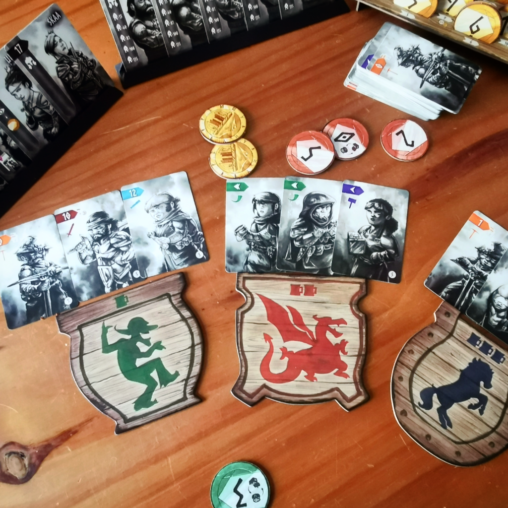 Vamos al meollo del asunto. Durante cada ronda del juego se roban cartas del mazo central que contiene enanos que pueden pertenecer a cinco gremios diferentes representados con colores y se colocan a medida que salen en los tres tableros centrales que representan tabernas donde vas a reclutar a tu ejército. Siempre hay tres tabernas pero el número de cartas es variable dependiendo la cantidad de jugadores. Cada jugador comienza la partida con cinco monedas de valores 5, 4, 3, 2 y 0. Con las cartas vistas vas a asignar una moneda boca abajo a cada taberna representada en tu tablero personal y te sobrarán dos monedas que van en unas muescas en la parte inferior. Luego se revela la primera moneda asignada a la primera taberna. El que haya colocado la moneda más alta tendrá derecho a elegir primero y así se continúa hasta que todos tengan un enano de esa taberna. Esto no pretende ser una guía de como jugar así que no voy a entrar en detalles, pero te cuento que hay un elegante y sencillo sistema para resolver empates. Este procedimiento se repite en cada taberna y luego de completado, se recuperan las monedas, se reparten nuevas cartas y de vuelta a empezar. A todo esto te estarás preguntando qué sentido tiene tener una moneda de valor 0, cuando son tres tabernas y cinco monedas. Bueno, allí radica el aspecto más original del juego. Si en alguna de las tres tabernas asignaste tu moneda sin valor, lo más seguro es que te lleves la carta que nadie más quería. Como recompensa por tal sacrificio vas a mostrar las dos monedas sobrantes, sumar sus valores y obtener una nueva moneda igual a ese resultado. La idea es que en todo momento vas a tener cinco monedas, ya que las más grande de esa dos se descarta, pero así, vas mejorando tus posibilidades. Esto no solo es muy útil a la hora de reclutar, sino también para el puntaje final considerando que las monedas se suman.