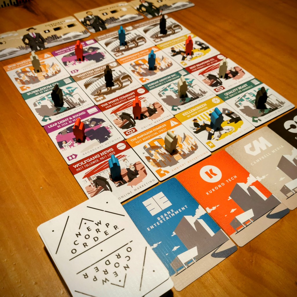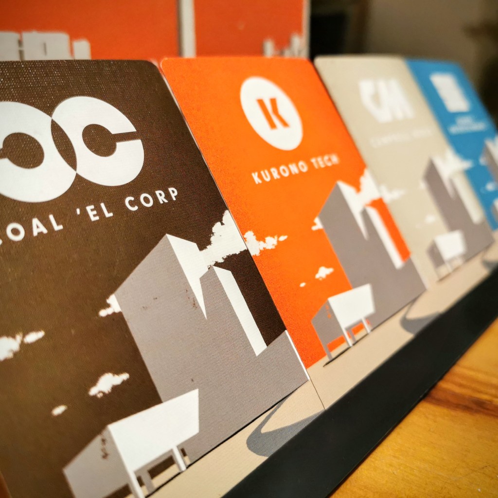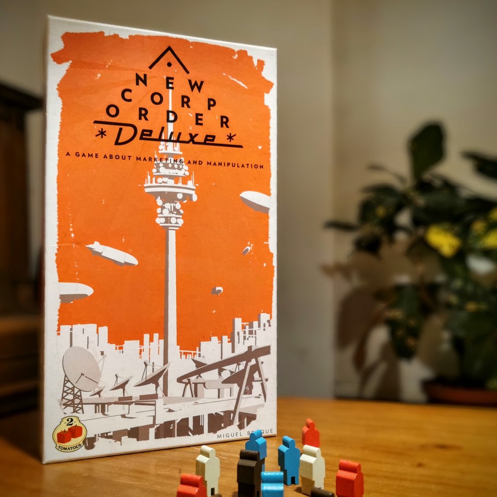 New Corp Order llamó mi atención por su estilo gráfico, su premisa de batalla comercial, faroleo, y su tiempo de juego acotado.
