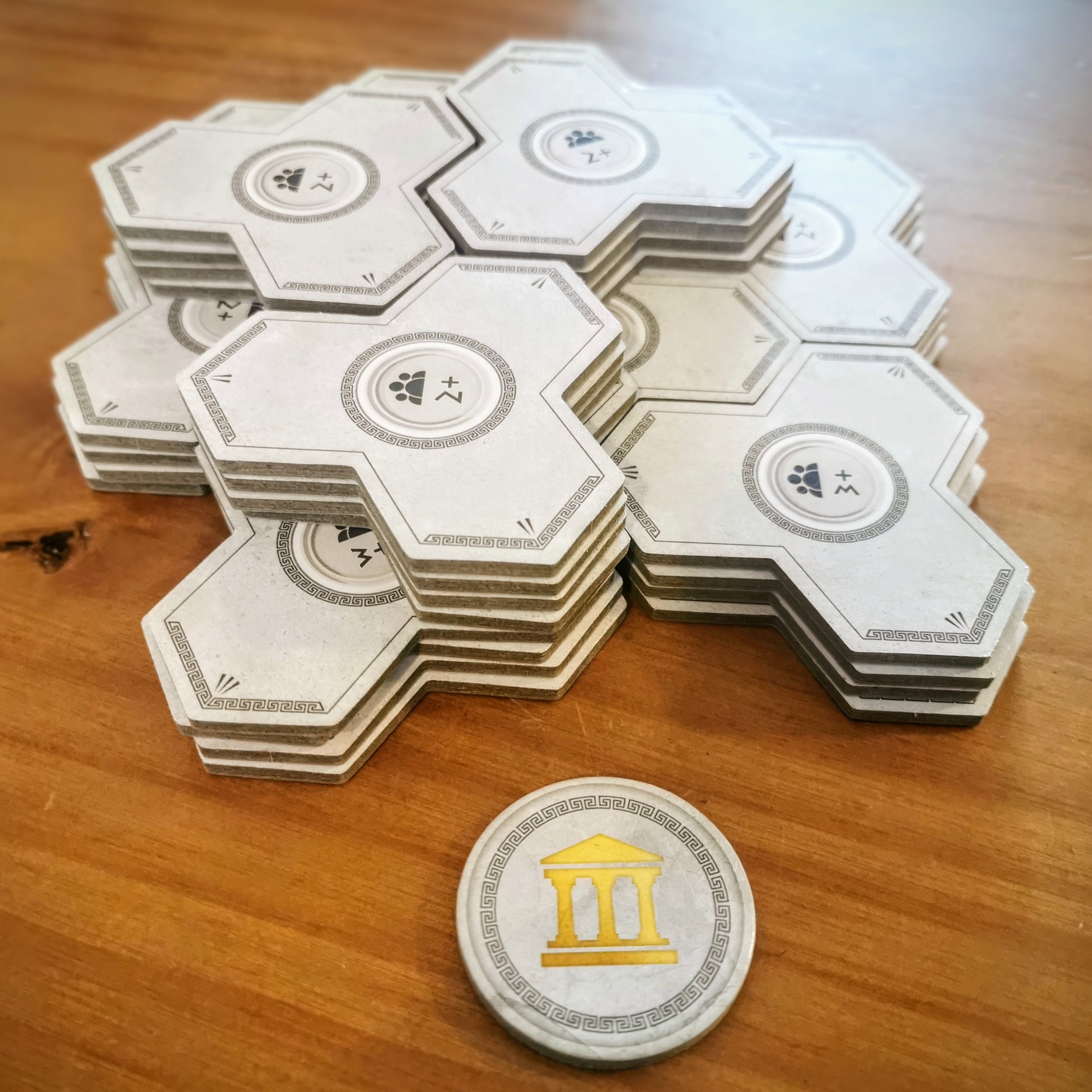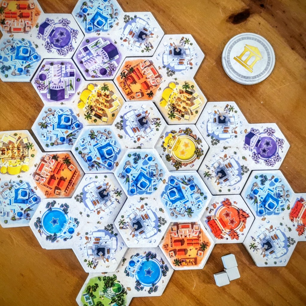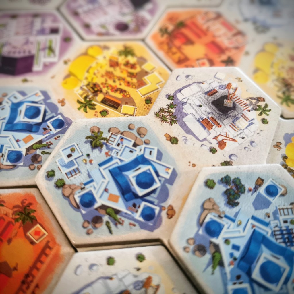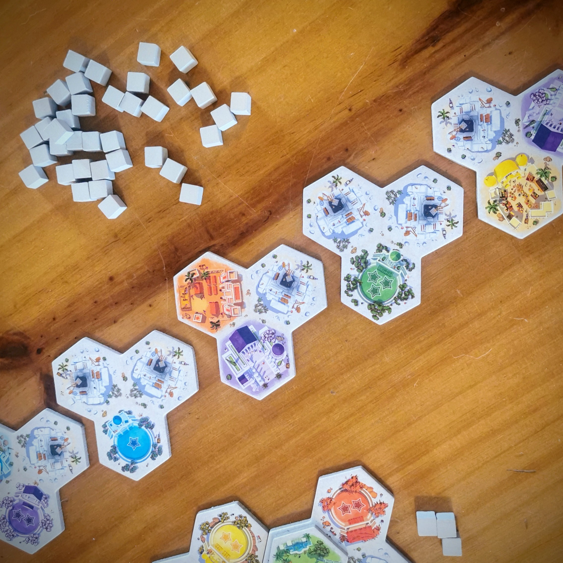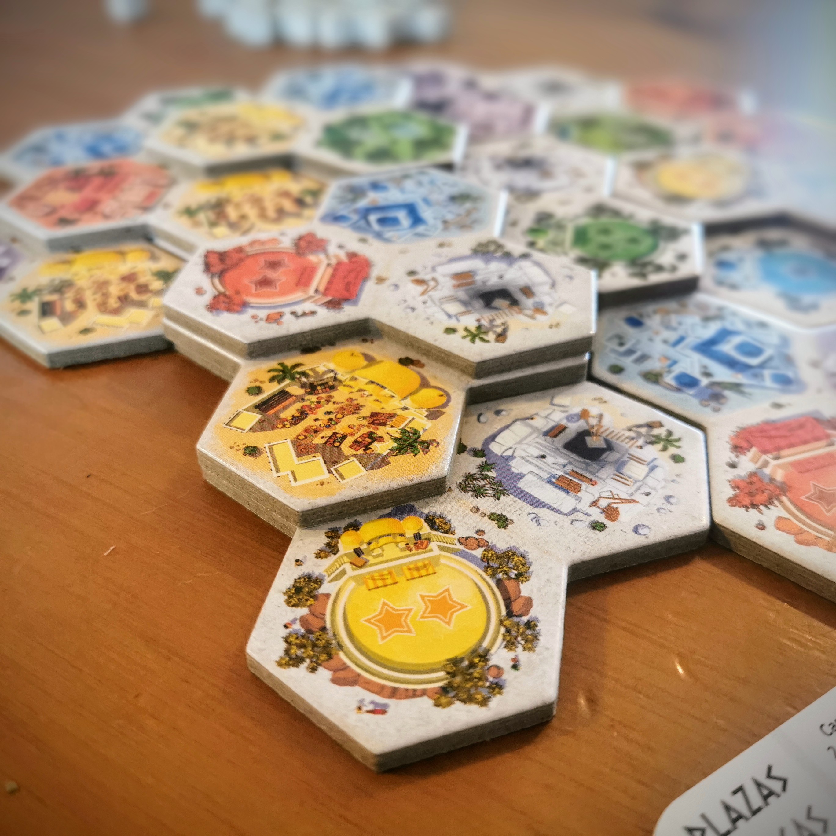 En cada turno, el jugador elige una loseta del mercado común y la coloca en su ciudad, ya sea expandiéndose en horizontal o apilando las losetas para aumentar su altura. La primera de la fila es gratuita, pero para acceder a las otras debo pagar con piedras. Colocar losetas sobre canteras es esencial para ganar más piedras y tener flexibilidad, además de que construir en niveles superiores es beneficioso porque el resto de los distritos que otorgan puntos multiplican su valor dependiendo de la altura en la que se encuentran