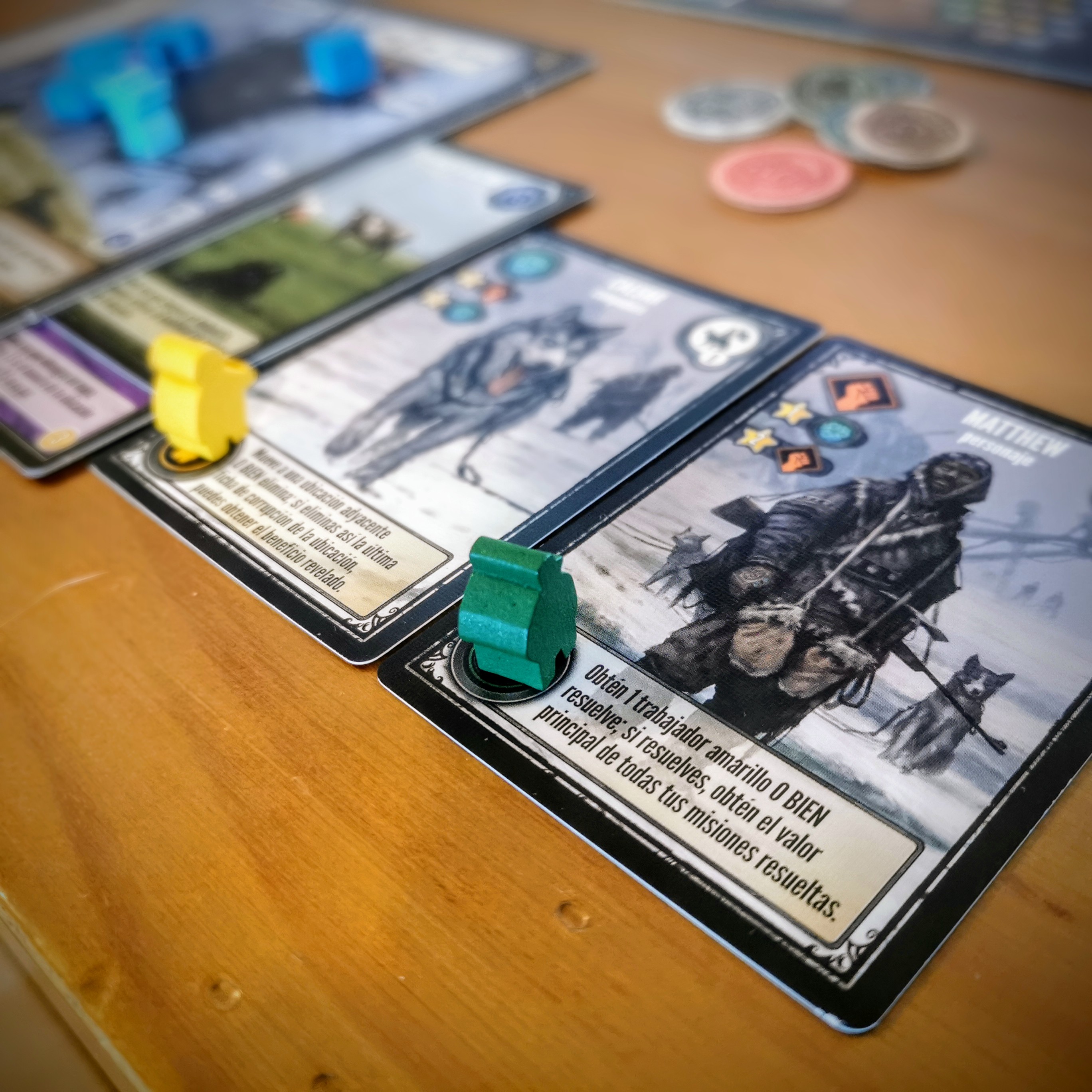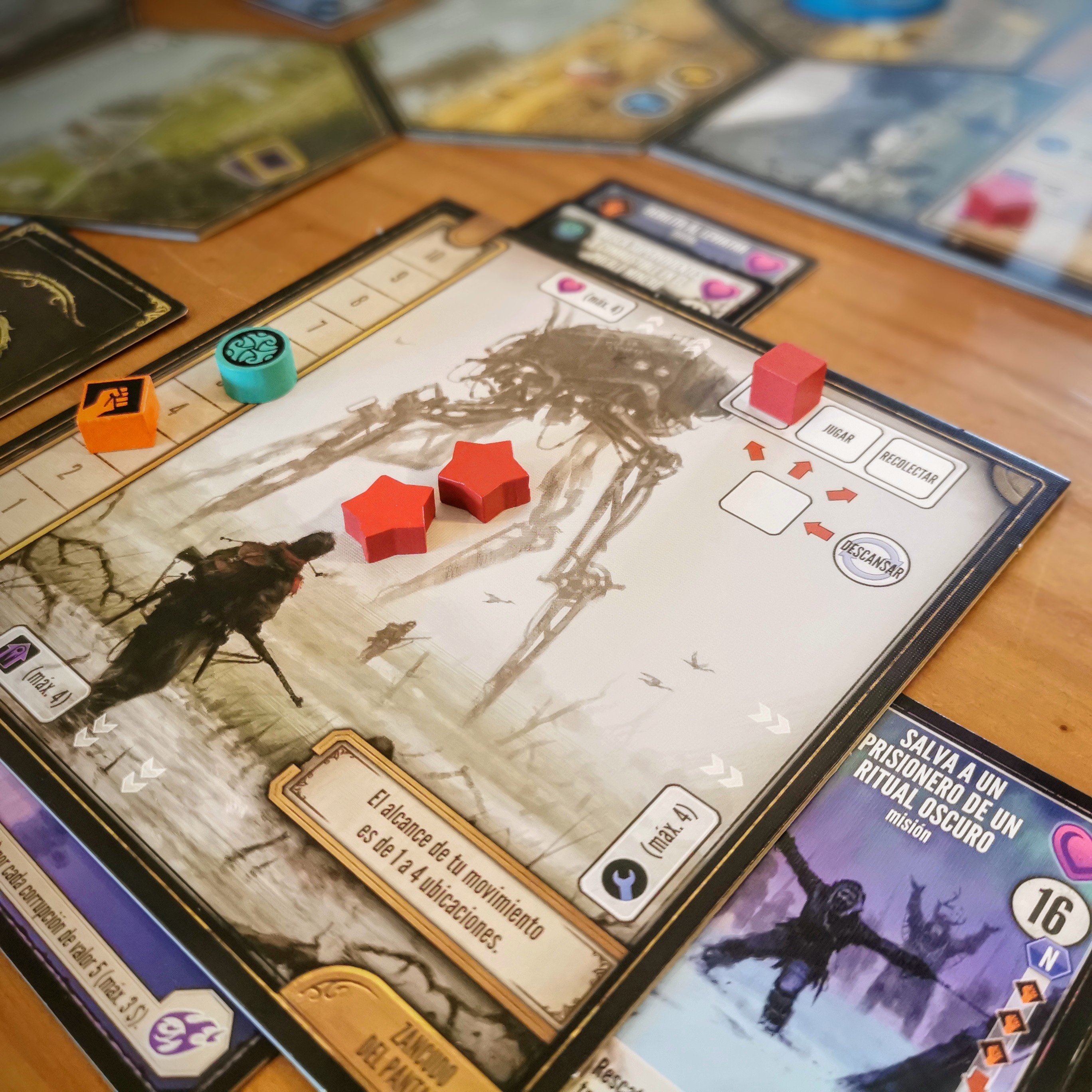 Las cartas son la clave: Al jugarlas se activan e incluso algunas mantienen sus efectos mientras están en el área de juego. Luego podrán ser adosadas al tablero del jugador para conseguir logros y beneficios. También tendremos la tarea de despejar las corrupción de estas tierras con fuerza o astucia. Al igual que con Scythe hay una batería de logros vinculadas a estas tareas. Cuando un jugador obtiene cuatro se desencadena el final de la partida que premiará a quien mas monedas haya conseguido y la mayoría se ganan al final del juego dependiendo de los logros obtenidos, artefactos equipados, misiones cumplicads