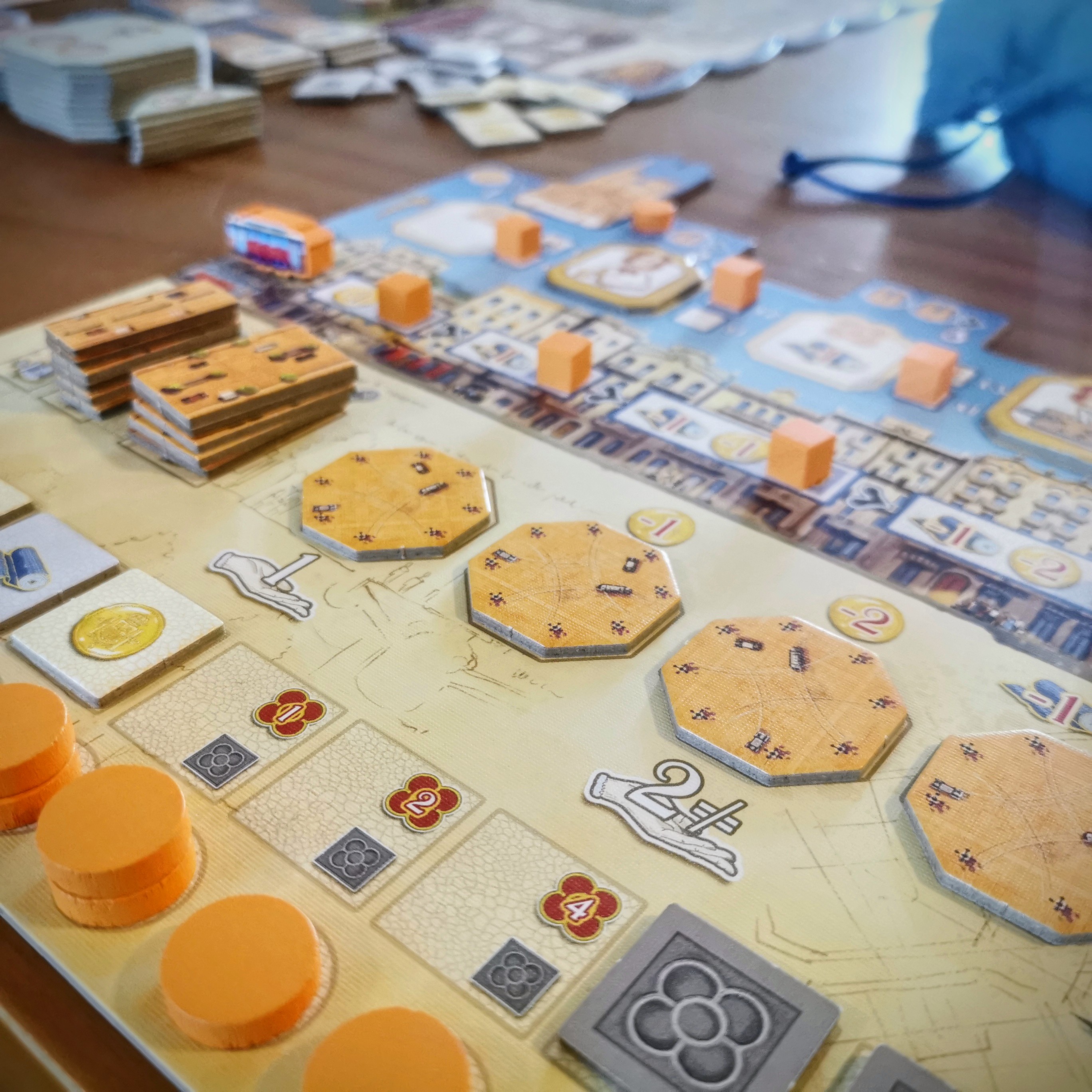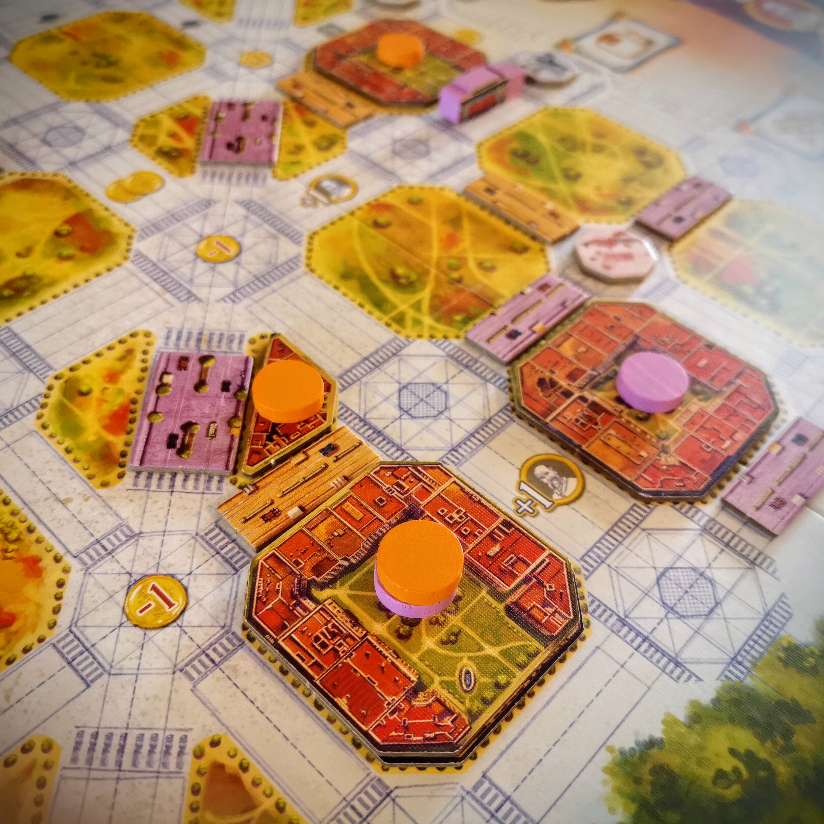 Luego, dependiendo de las fichas de ciudadano que haya alrededor de alguna de las manzanas de la grilla (hay de 3 estratos sociales) se puede construir un edificio allí. Los ciudadanos usados con tal fin pasan al track correspondiente. Cuando se completa uno de ellos desencadena una de las tres fases de puntaje con objetivos diversos. Al terminar la tercera ronda de puntaje, y tras sumar algunos puntos finales termina la partida.