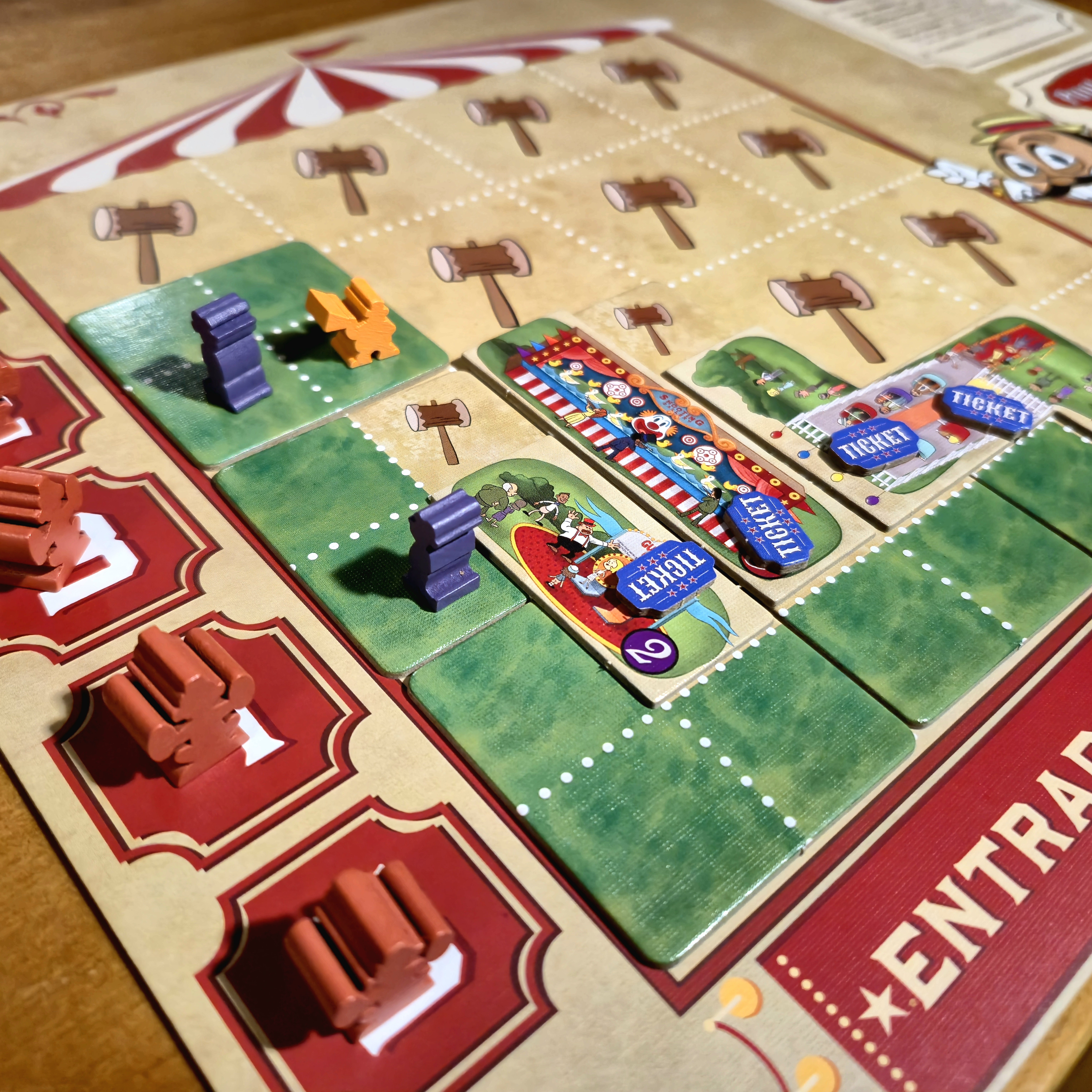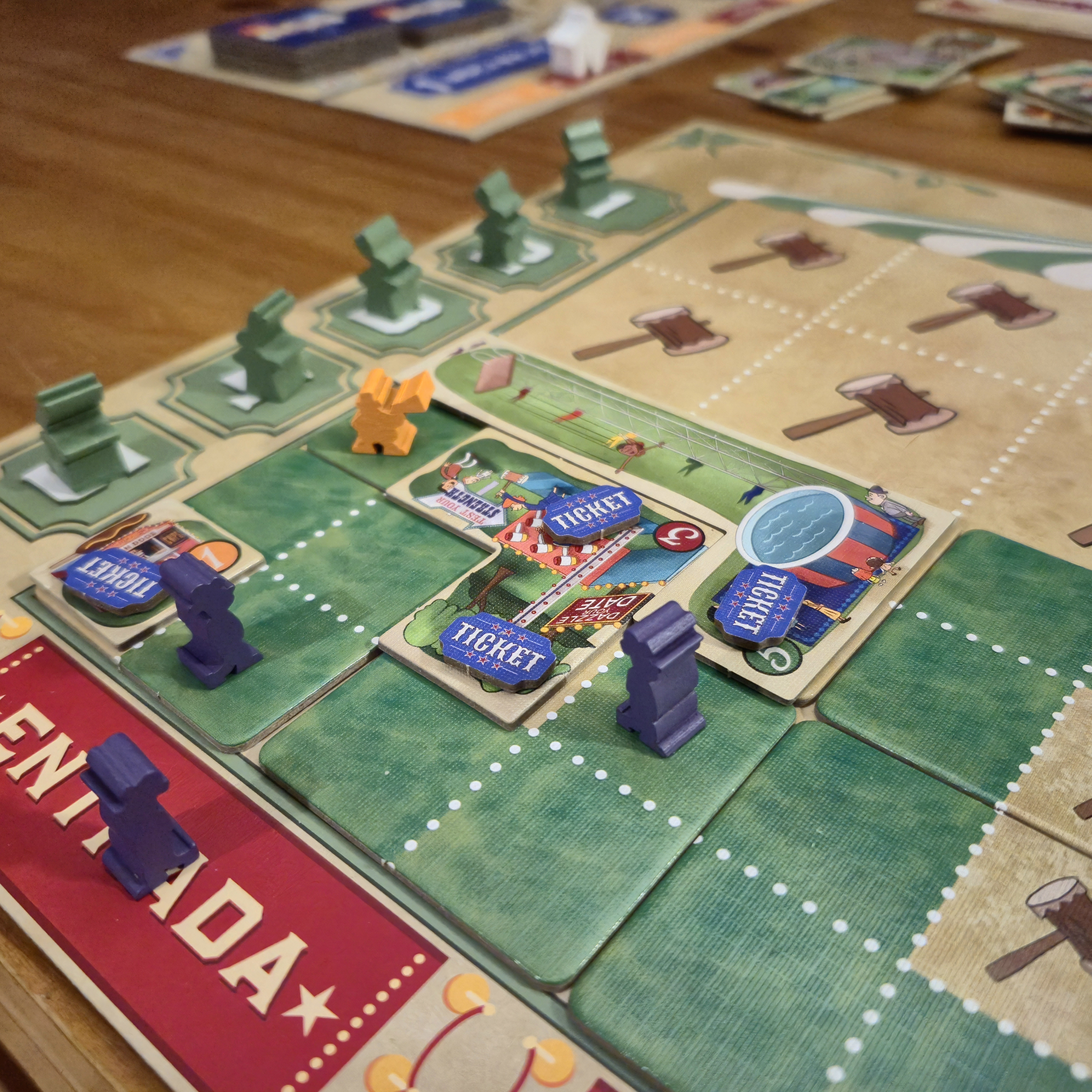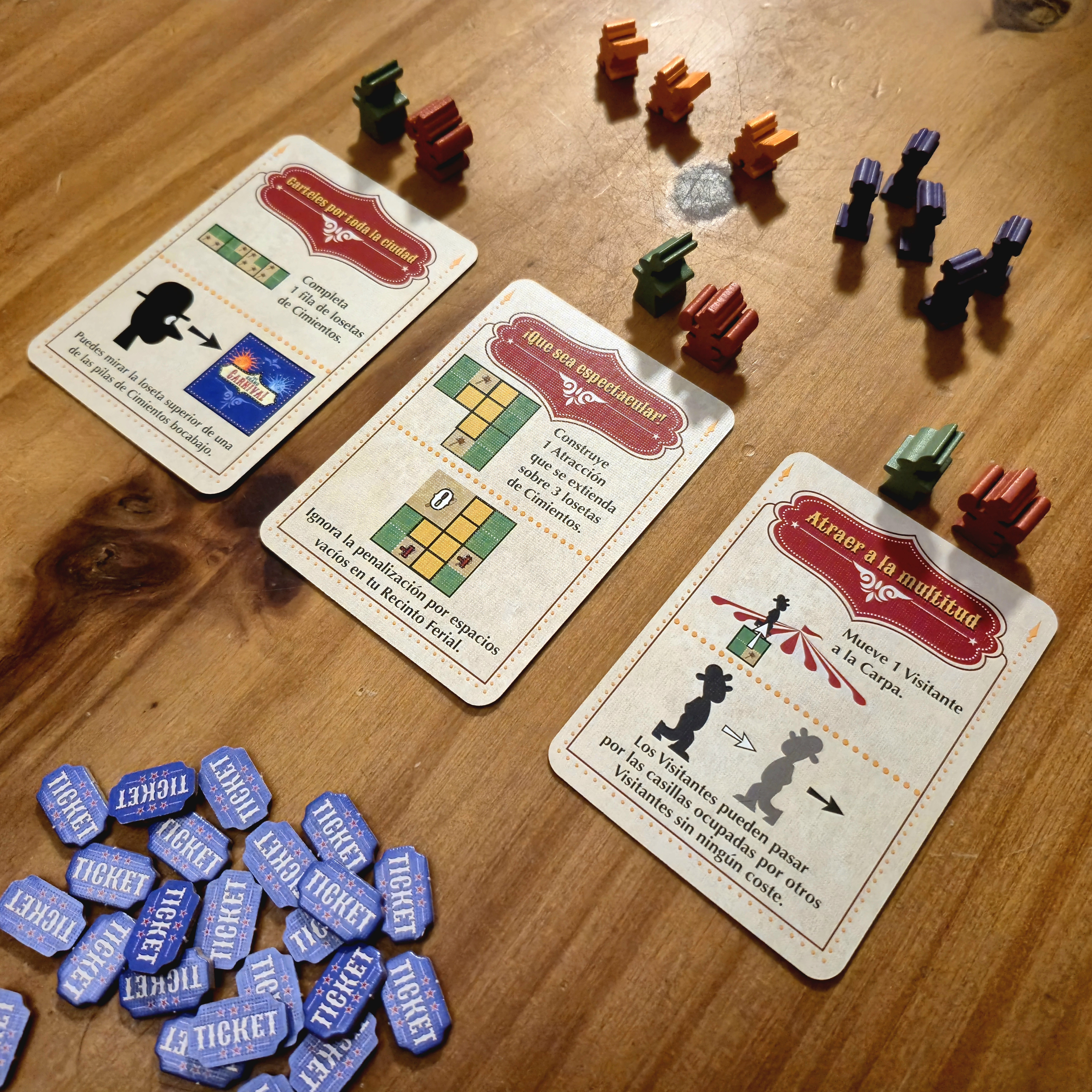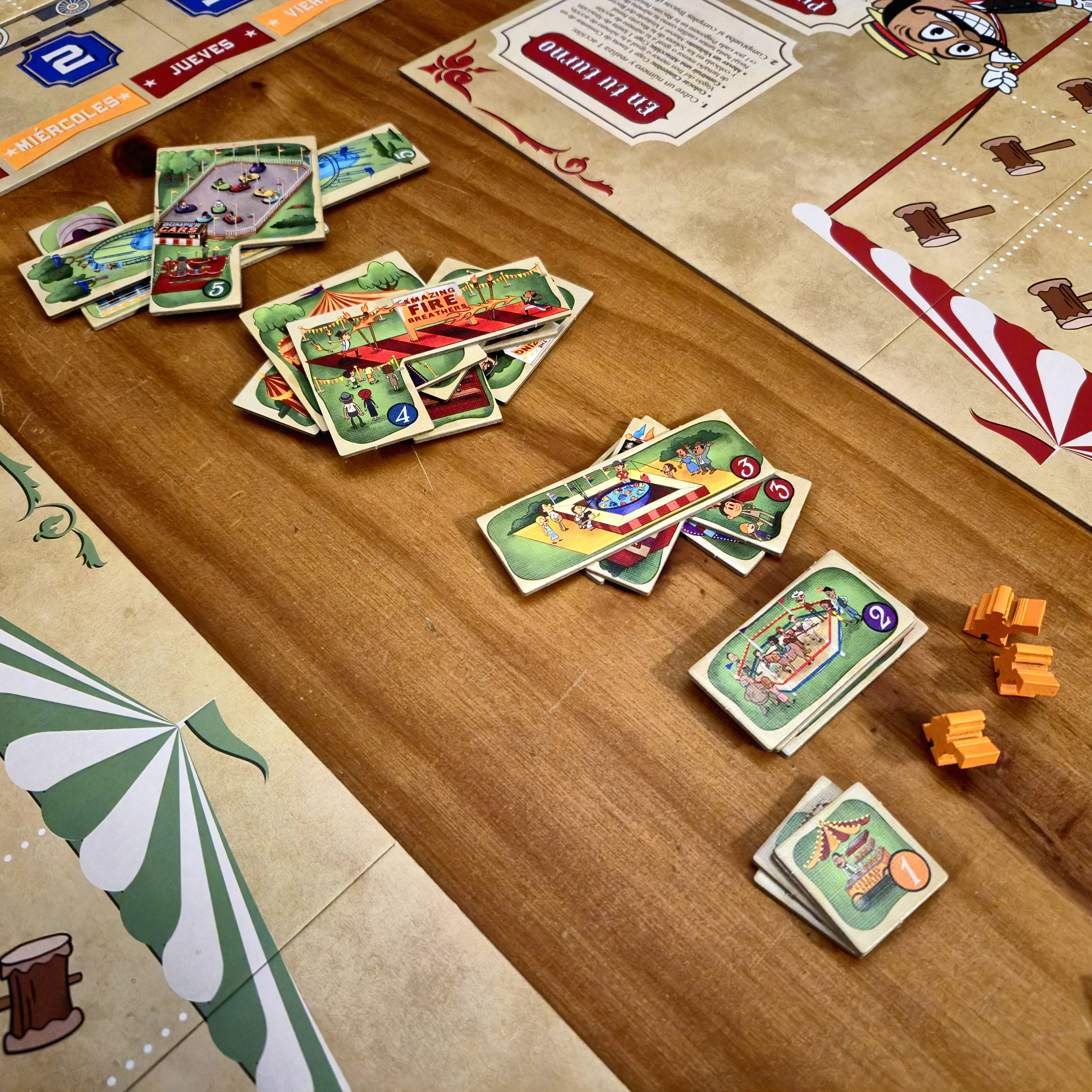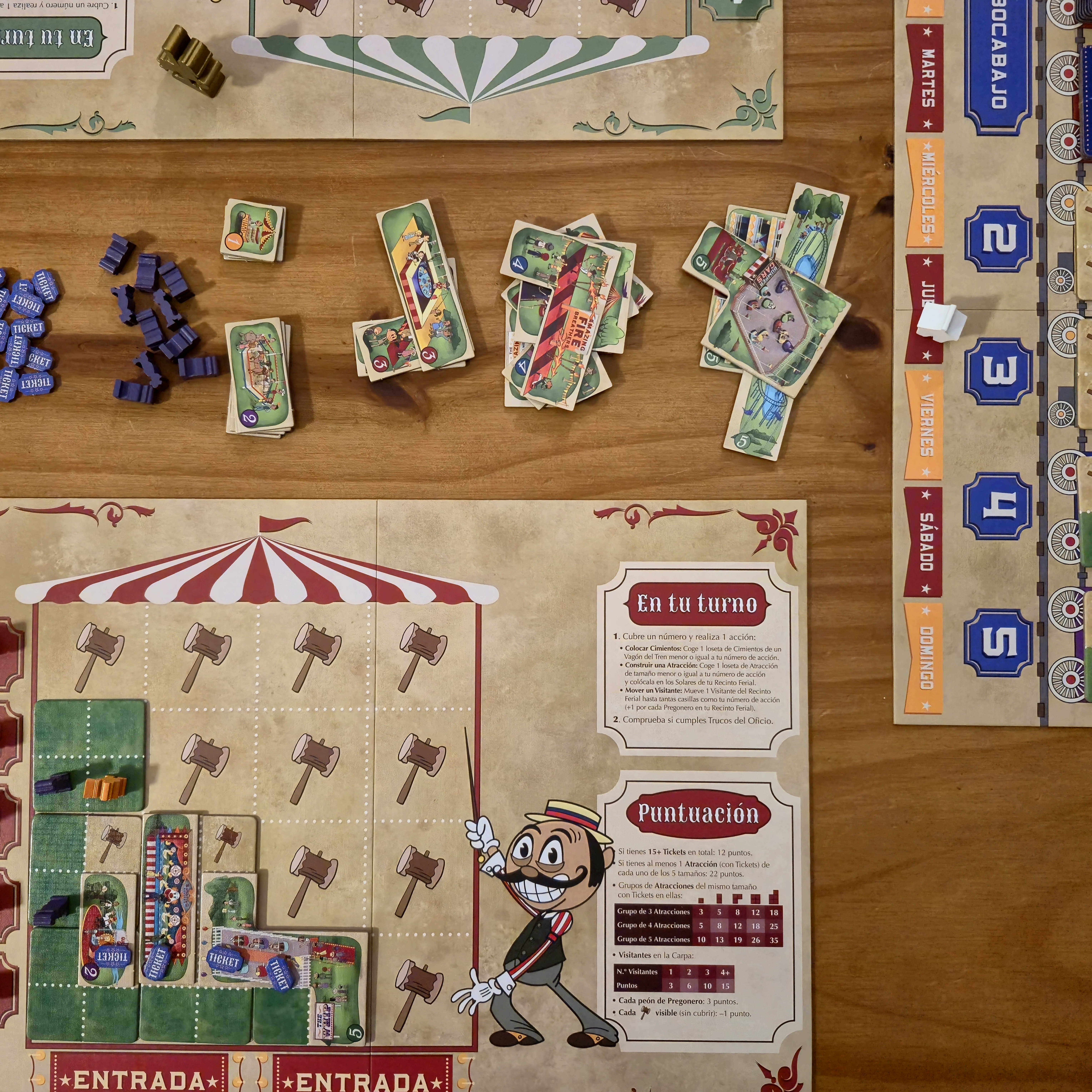 Todo esto importa teniendo en cuenta lo que puntuará al final. Tener al menos una atracción de cada tamaño y al menos 15 tickets vendidos son fuente significativa de puntos, pero también lo son armar conjuntos de atracciones del mismo tamaño y la cantidad de visitantes que recorren la feria de principio a fin.
