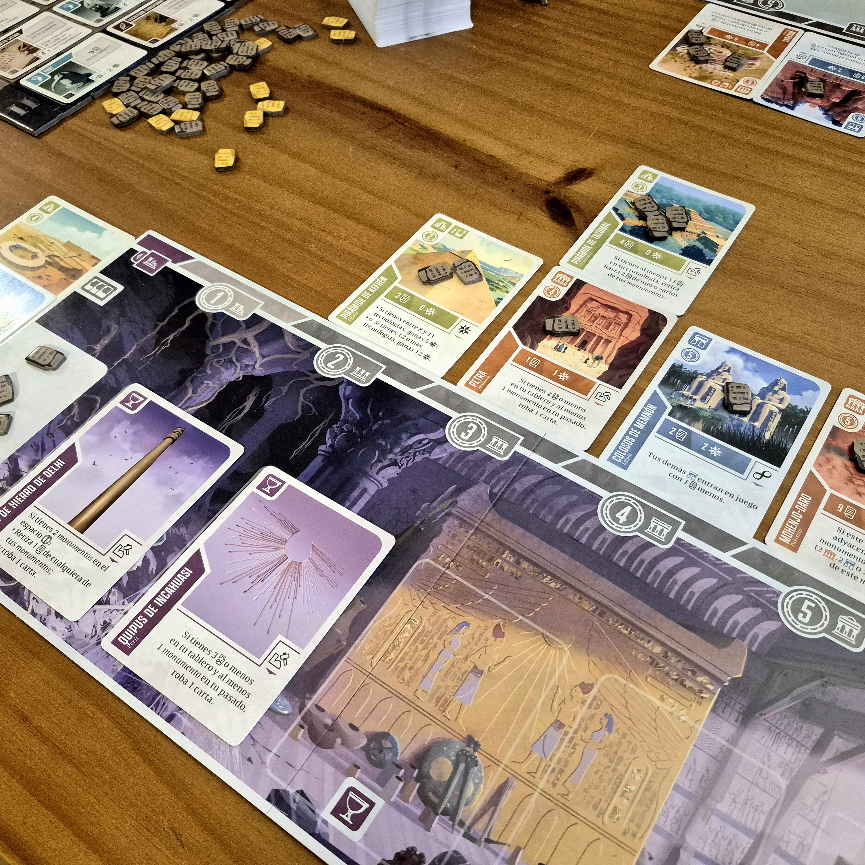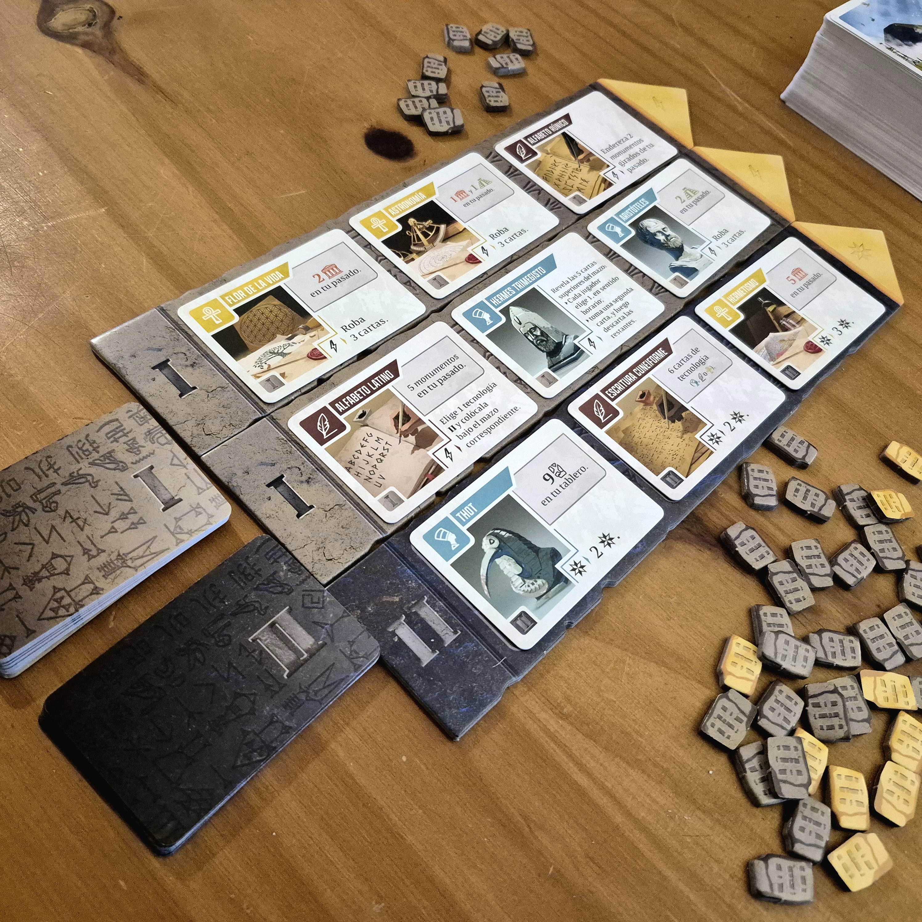 Cada jugador dispone de un tablero donde gestionará sus cartas, representando artefactos (cartas permanentes), monumentos (cartas que entran con una caducidad programada) y tecnologías. Los monumentos otorgan habilidades mientras están en juego y puntos al final, cuando pasan al pasado.