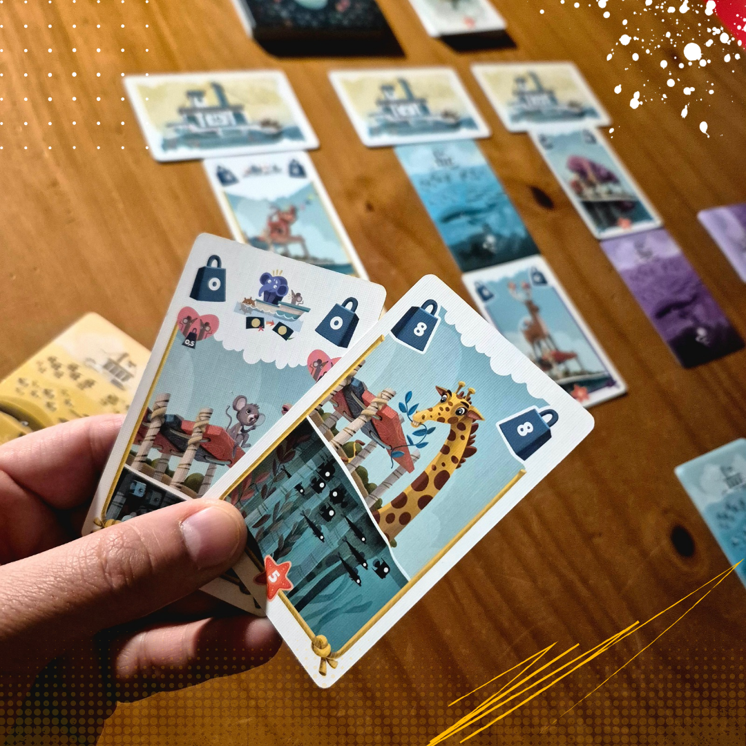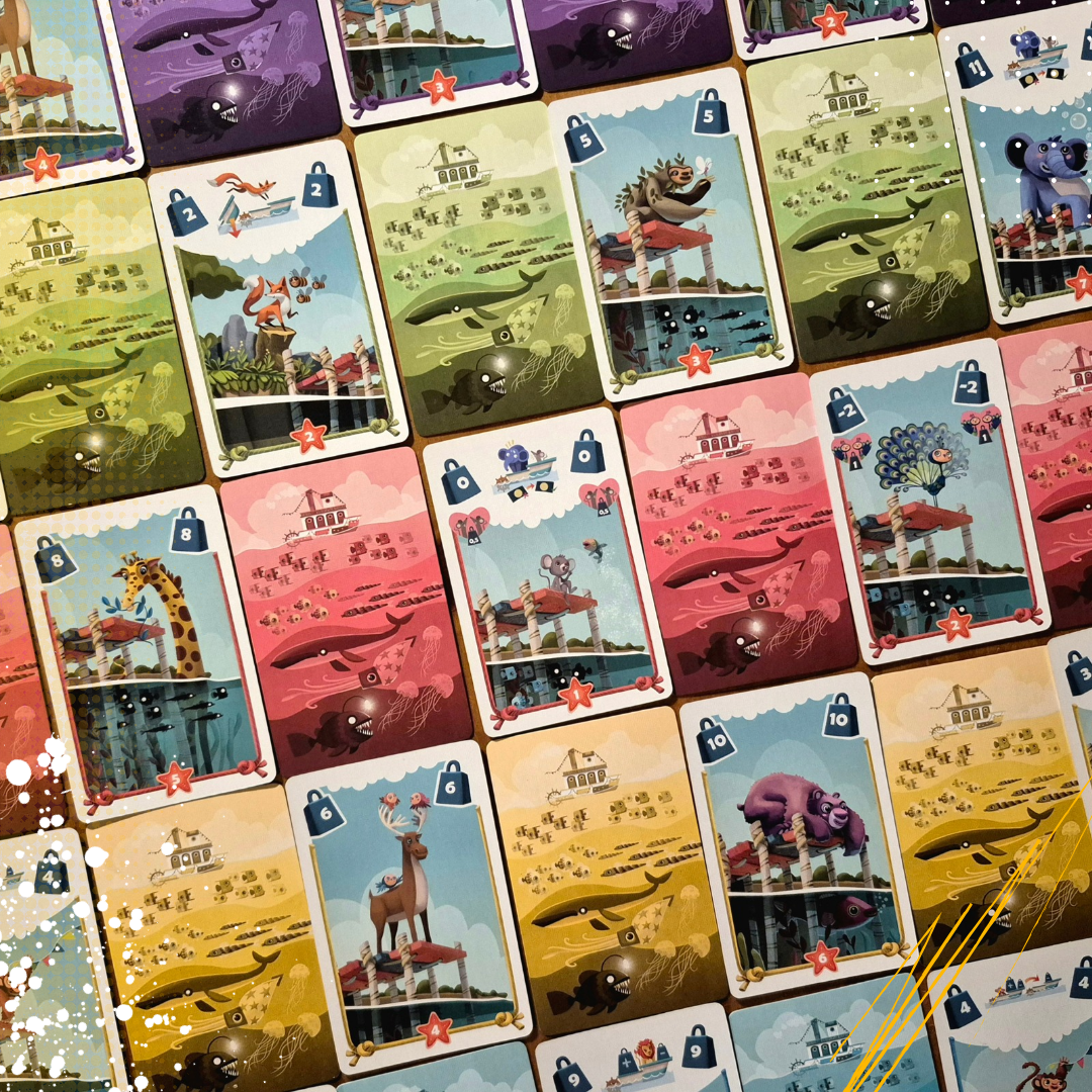 Cada jugador tiene un mazo idéntico con animales que debe rescatar de una inundación. En cada ronda hay barcos con capacidad limitada, y los jugadores los irán llenando carta a carta. Una vez completos, veremos cuáles flotan… y cuáles se hunden, ya que algunos animales fueron colocados en secreto. La gracia está en las habilidades de ciertos animales, que traen caos, empujones, romances y conflictos. ¡Todo un viaje!