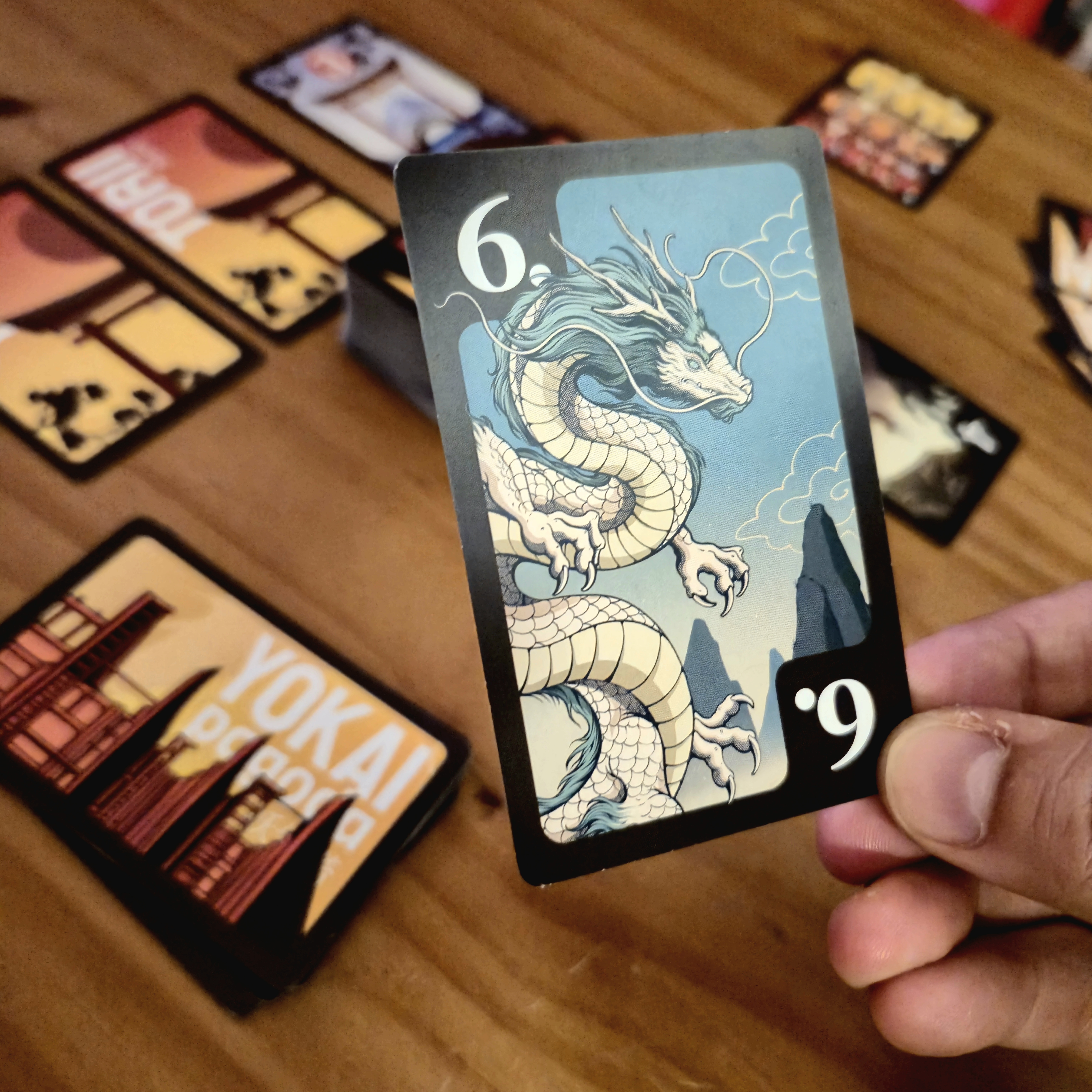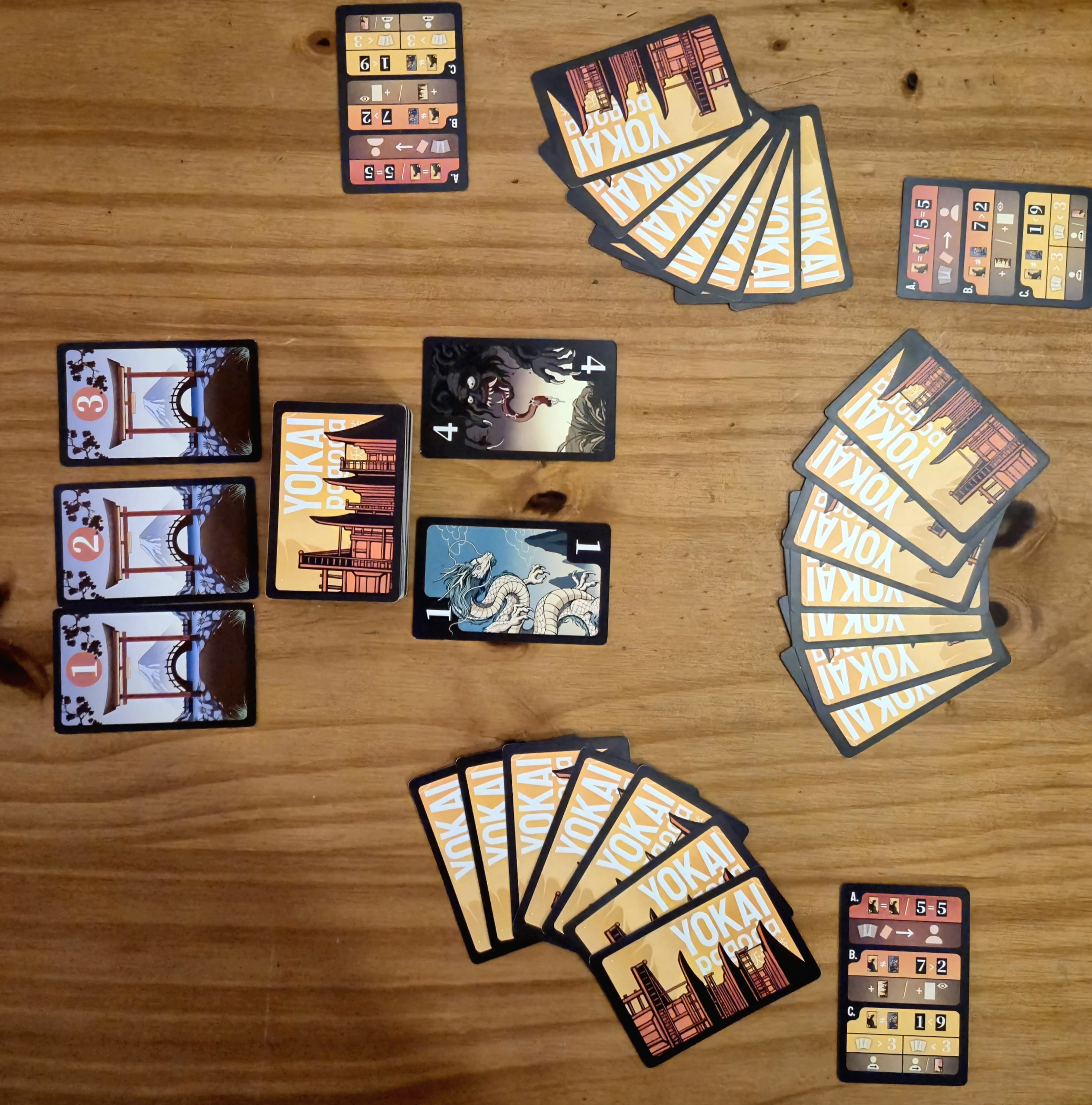 Cada ronda comienza con 7 cartas en mano, tomadas de un enorme mazo de 100 cartas compuesto por 10 cartas de valor 1 al 10 de 10 Yokai distintos. Sobre la mesa hay dos cartas boca arriba y, en el turno, se debe descartar una carta de la mano sobre una de ellas. Si la carta coincide en valor o en tipo de Yokai, el jugador puede dar una carta de su mano a un rival.