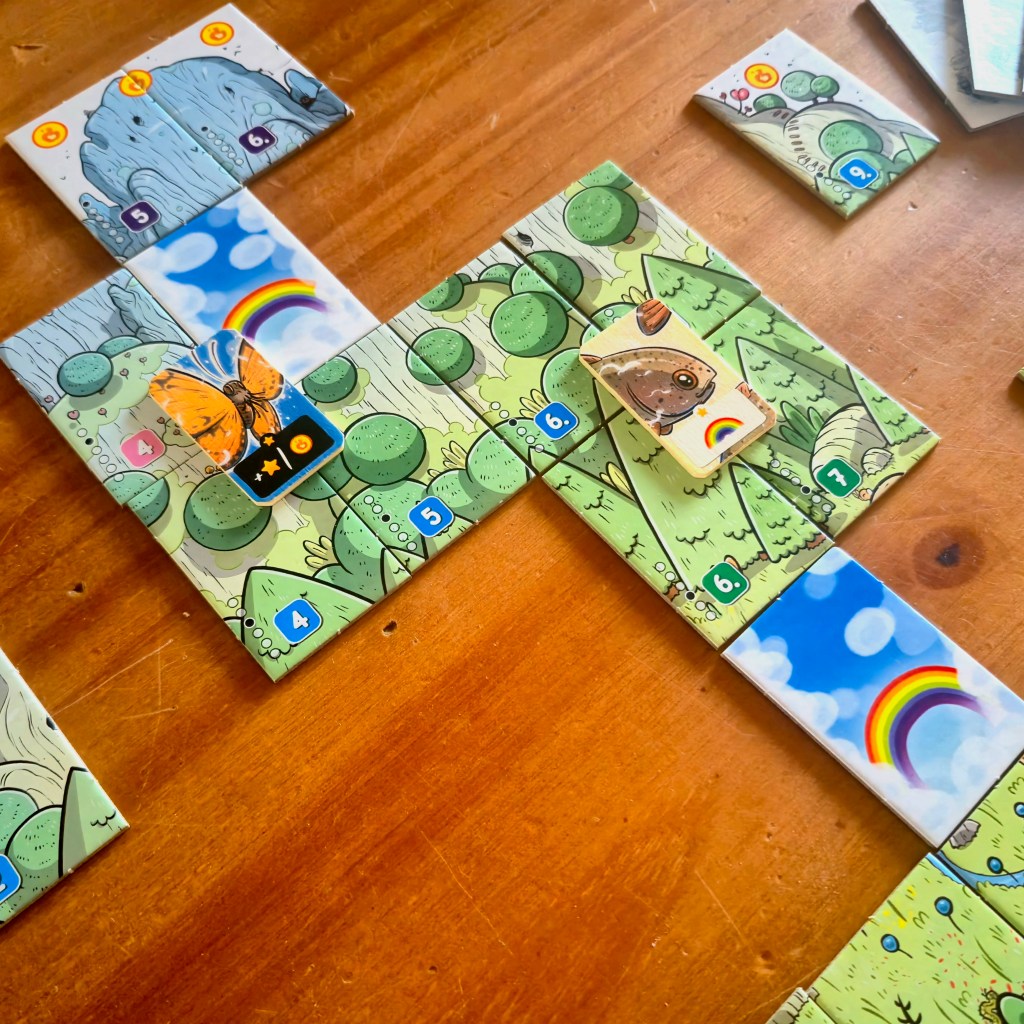 Si no hay coincidencia, se deja en el centro y se roba una nueva del montón. Si en esta segunda hay alguna coincidencia, se procede igual que antes, pero si no, se adquiere una loseta especial de arcoíris que funciona como comodín.