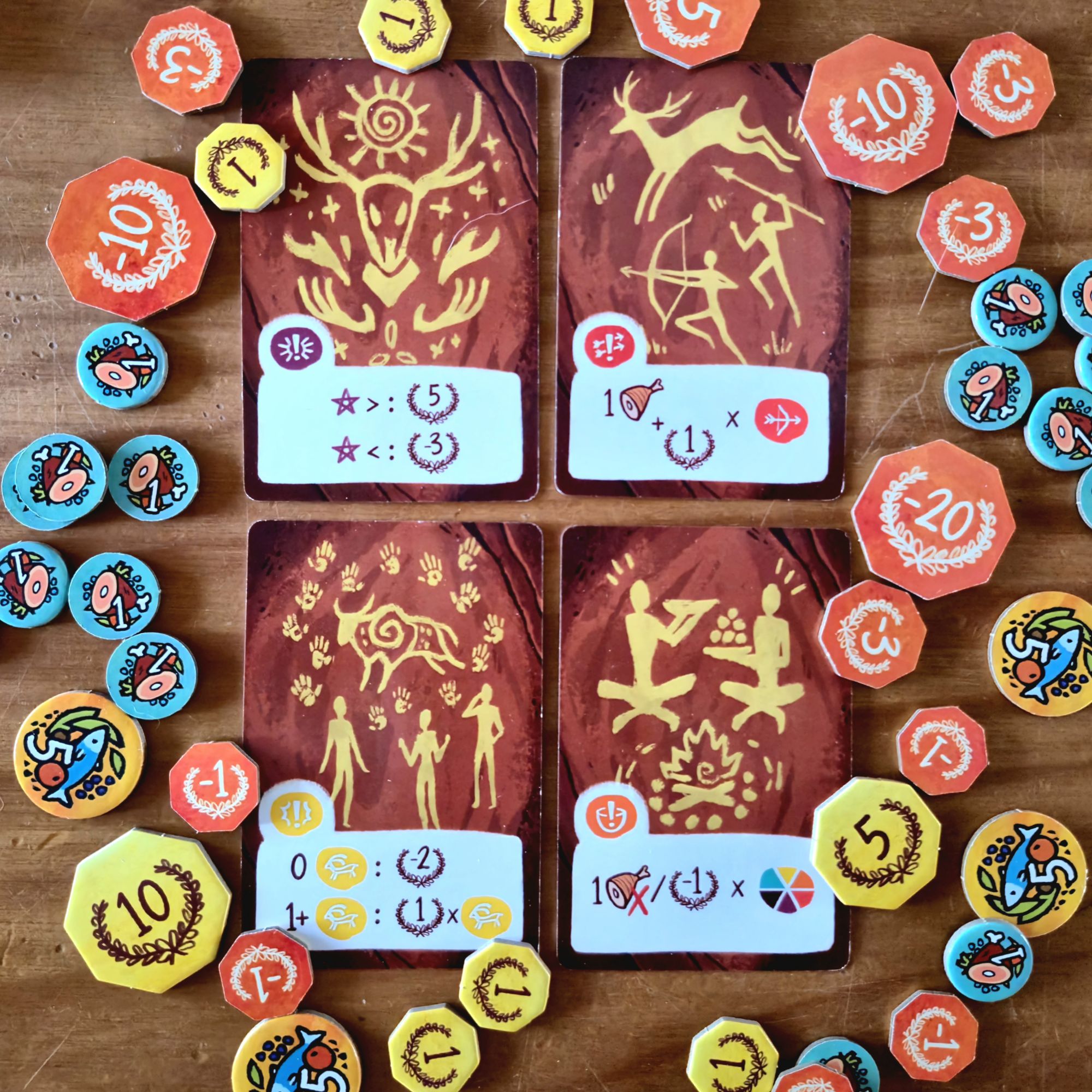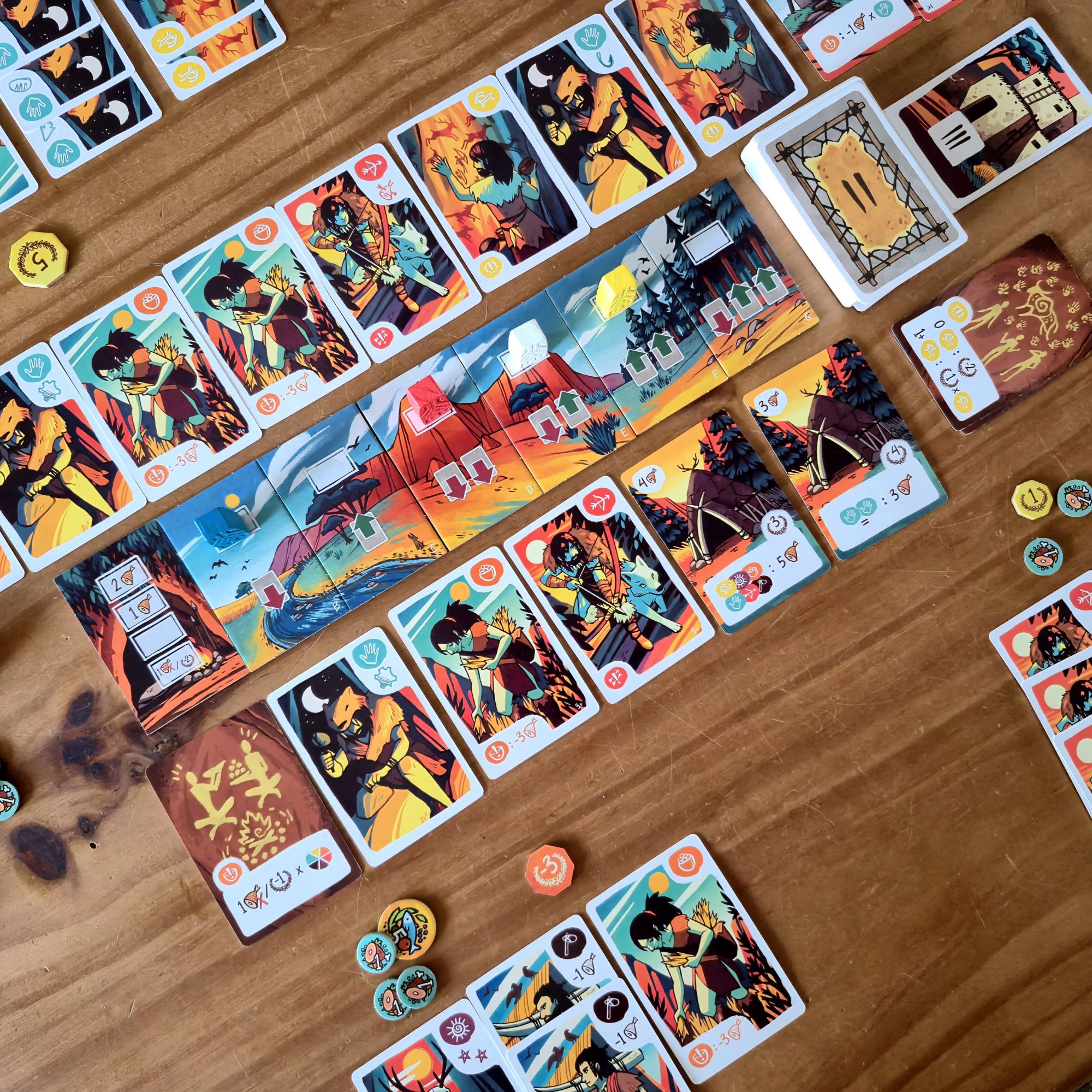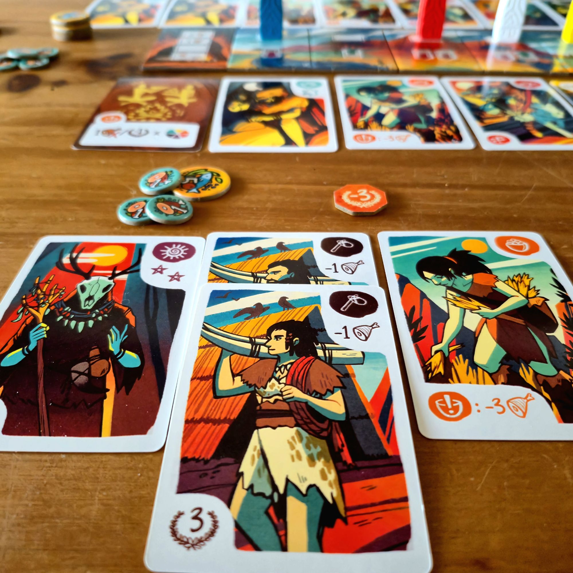 Cada era tendrá los mismos cuatro eventos: uno que involucra a chamanes, otro a artistas, uno a los cazadores y, el más devastador, el momento de alimentar a toda la tribu. Al finalizar la última ronda, y tras sumar los puntos extra por edificios, la partida termina.