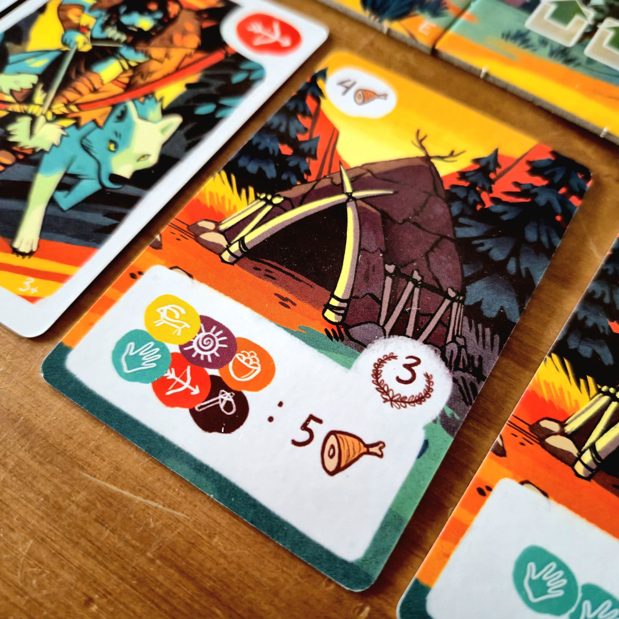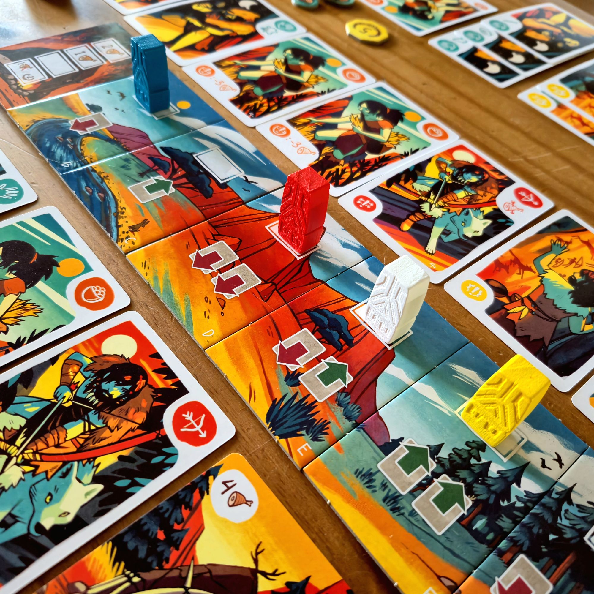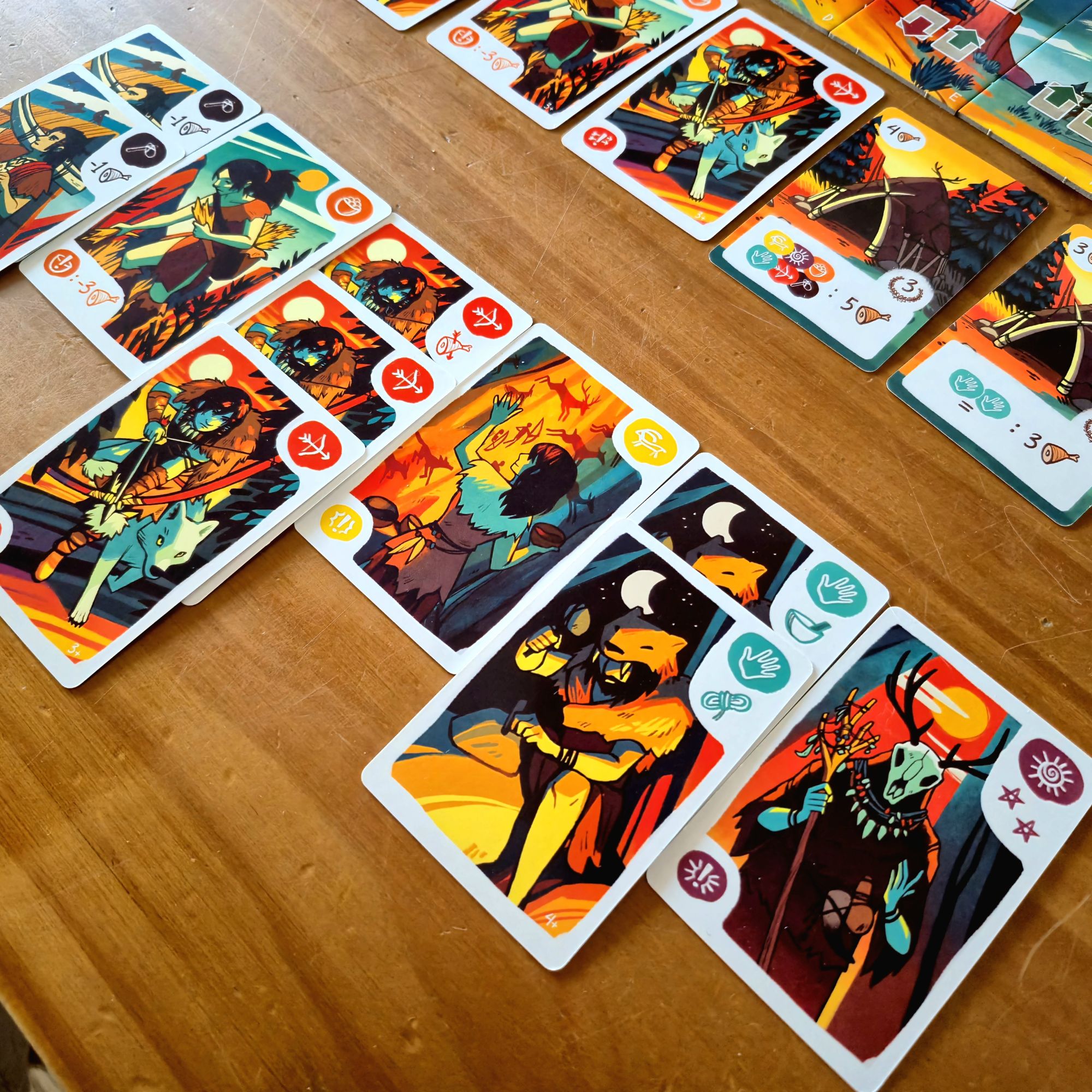 Cada era tendrá los mismos cuatro eventos: uno que involucra a chamanes, otro a artistas, uno a los cazadores y, el más devastador, el momento de alimentar a toda la tribu. Al finalizar la última ronda, y tras sumar los puntos extra por edificios, la partida termina.