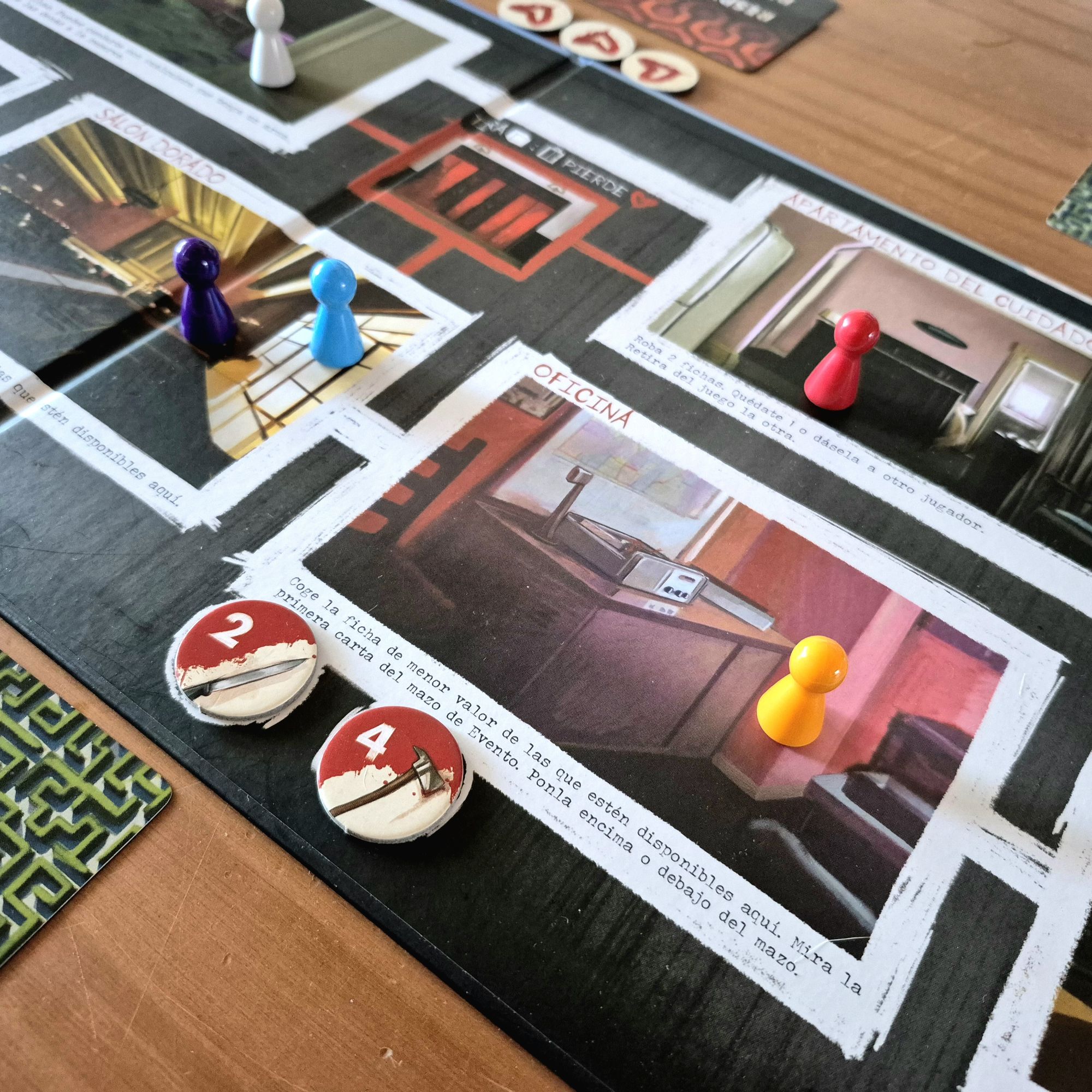 Las pequeñas herramientas que ofrece son suficientes para que, ya seas de los buenos o el malo, puedas cumplir tu misión de forma sutil. Poder mirar en secreto el evento por venir; las armas, que pueden prevenir ser corrompido pero también resultar mortales; presionar para conseguir algo a costa de la pila de fichas de la comunidad. Ni que hablar del laberinto de setos, que puede aislar a un posible corrompido o proteger a un compañero debilitado.