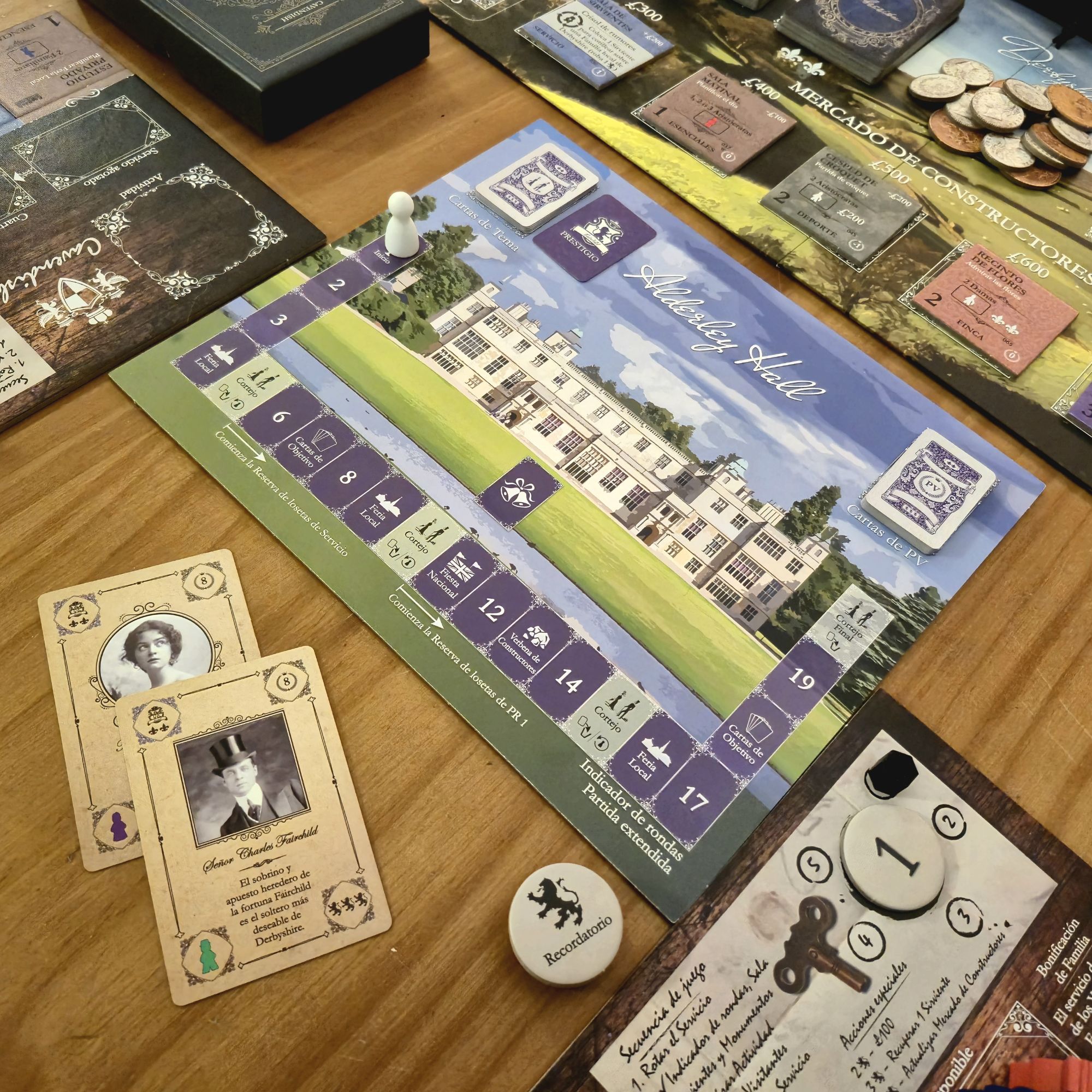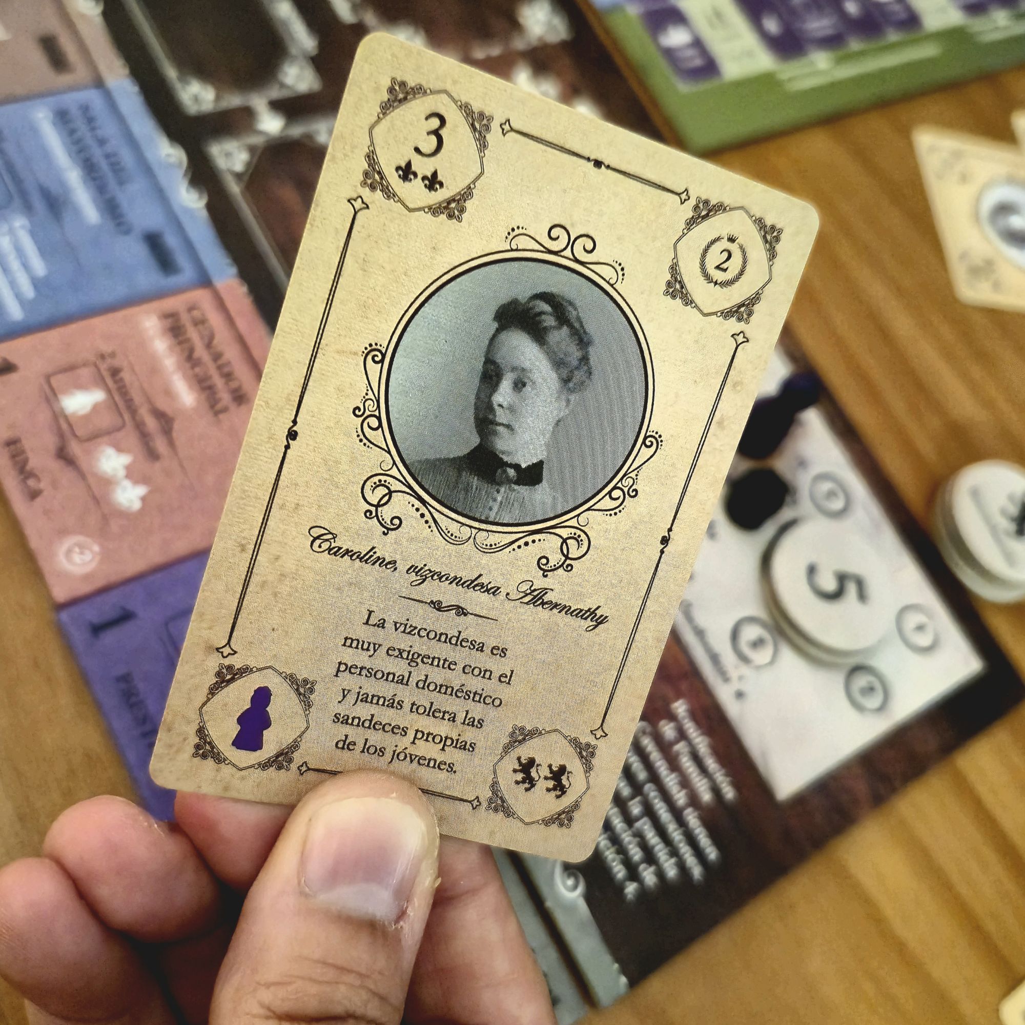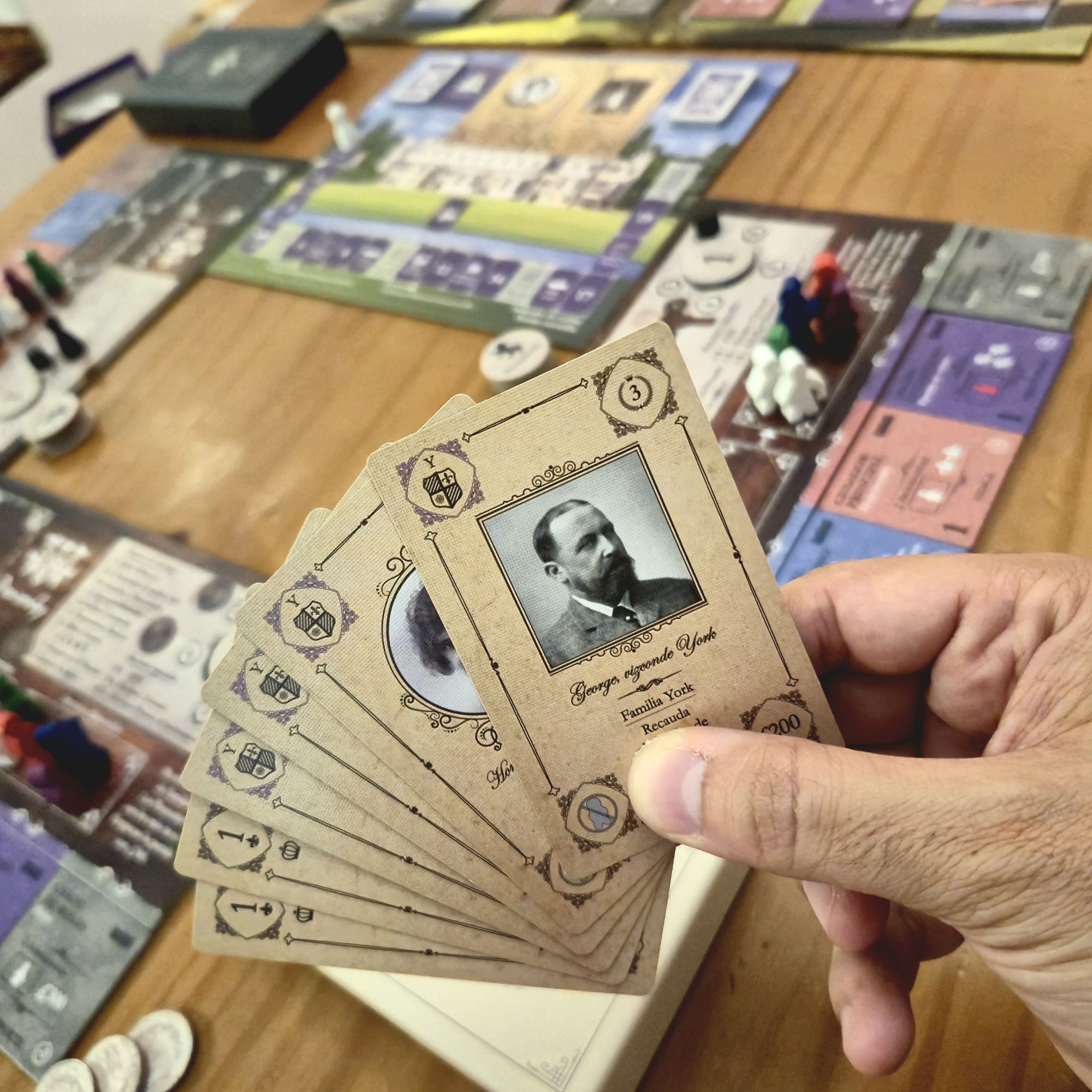 El otro aspecto que nutre la narrativa son las cartas de personaje. Cada una es distinta y, si bien desde el punto de vista mecánico solo nos interesa qué atributos modifica, los pequeños textos le dan una personalidad que se mantiene firme durante la partida. No es lo mismo recibir en nuestra hacienda al señor Charles Hobart, que tiene excelentes contactos pero una madre actriz, que al acaudalado vizconde Walmy, considerado un mujeriego incorregible.