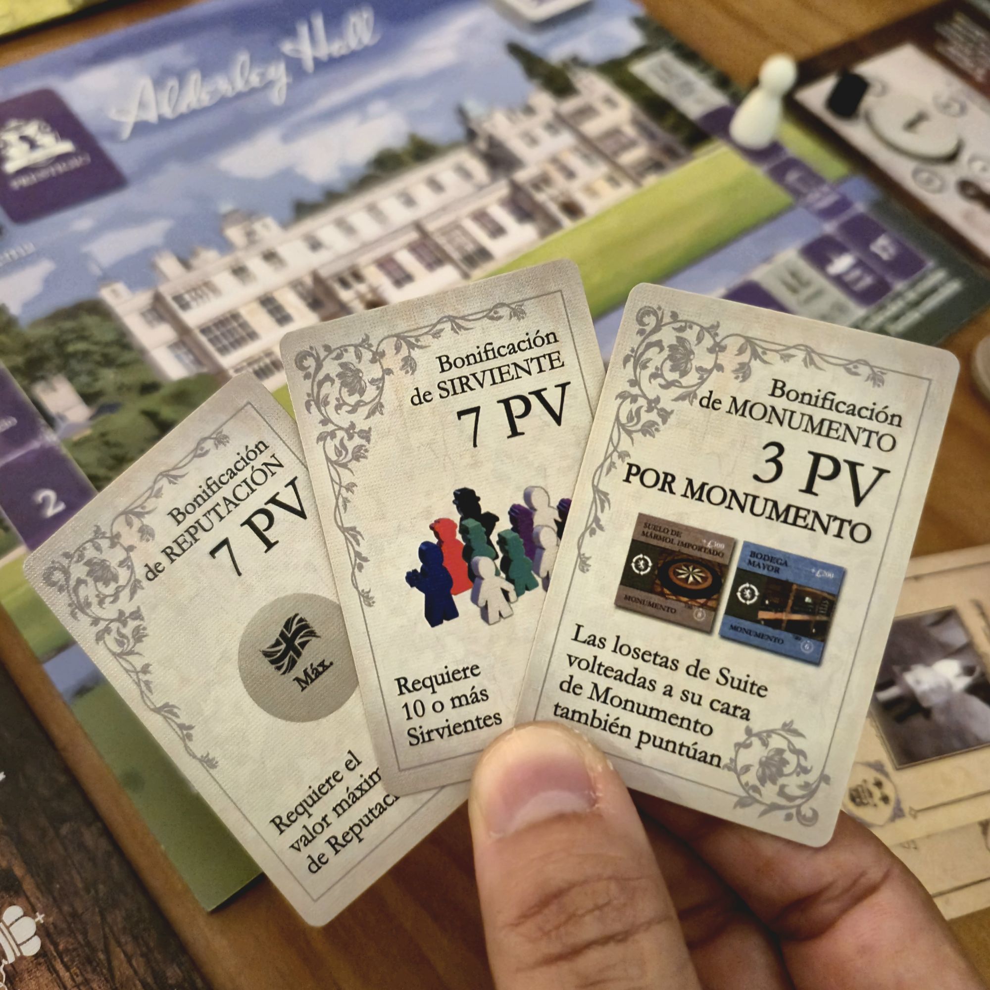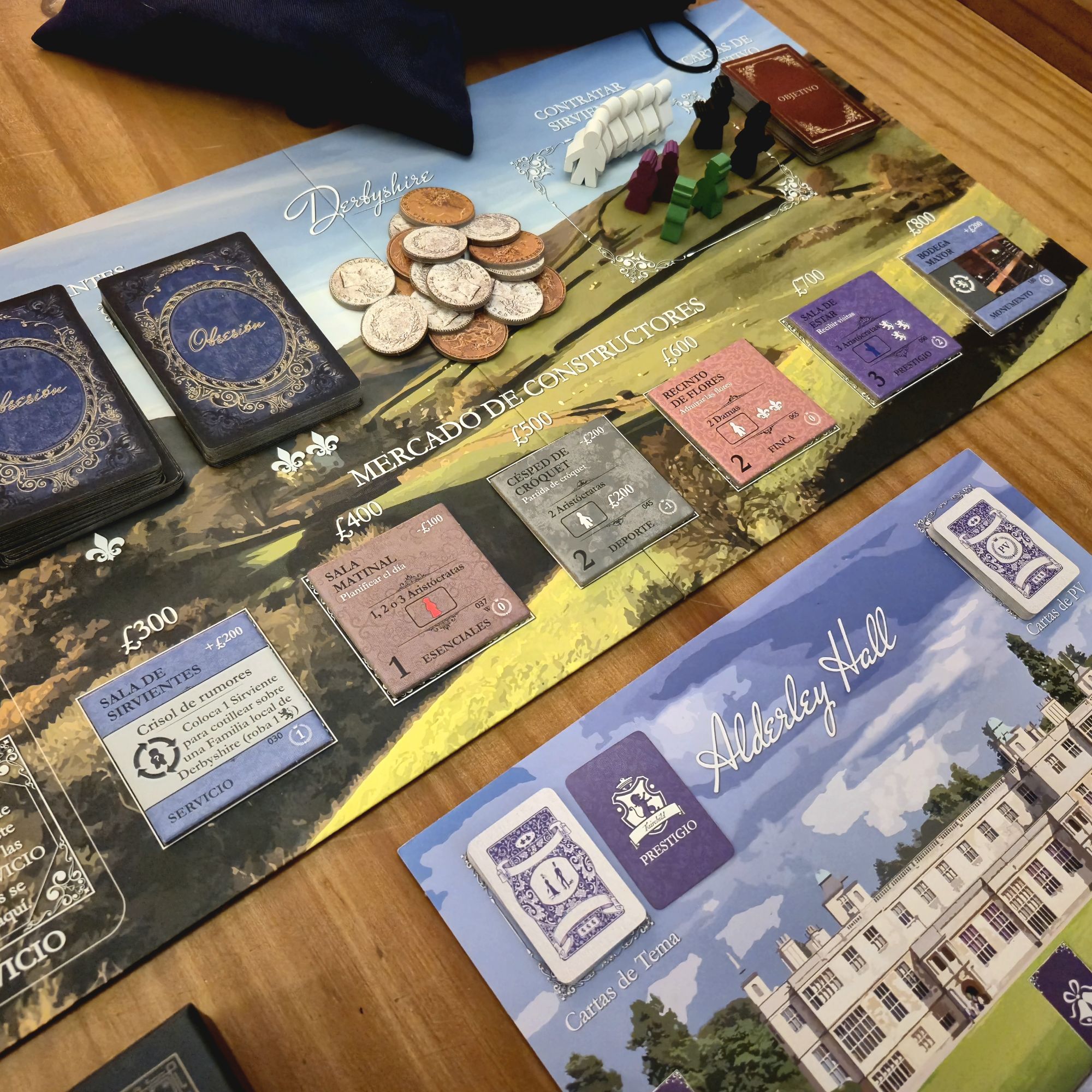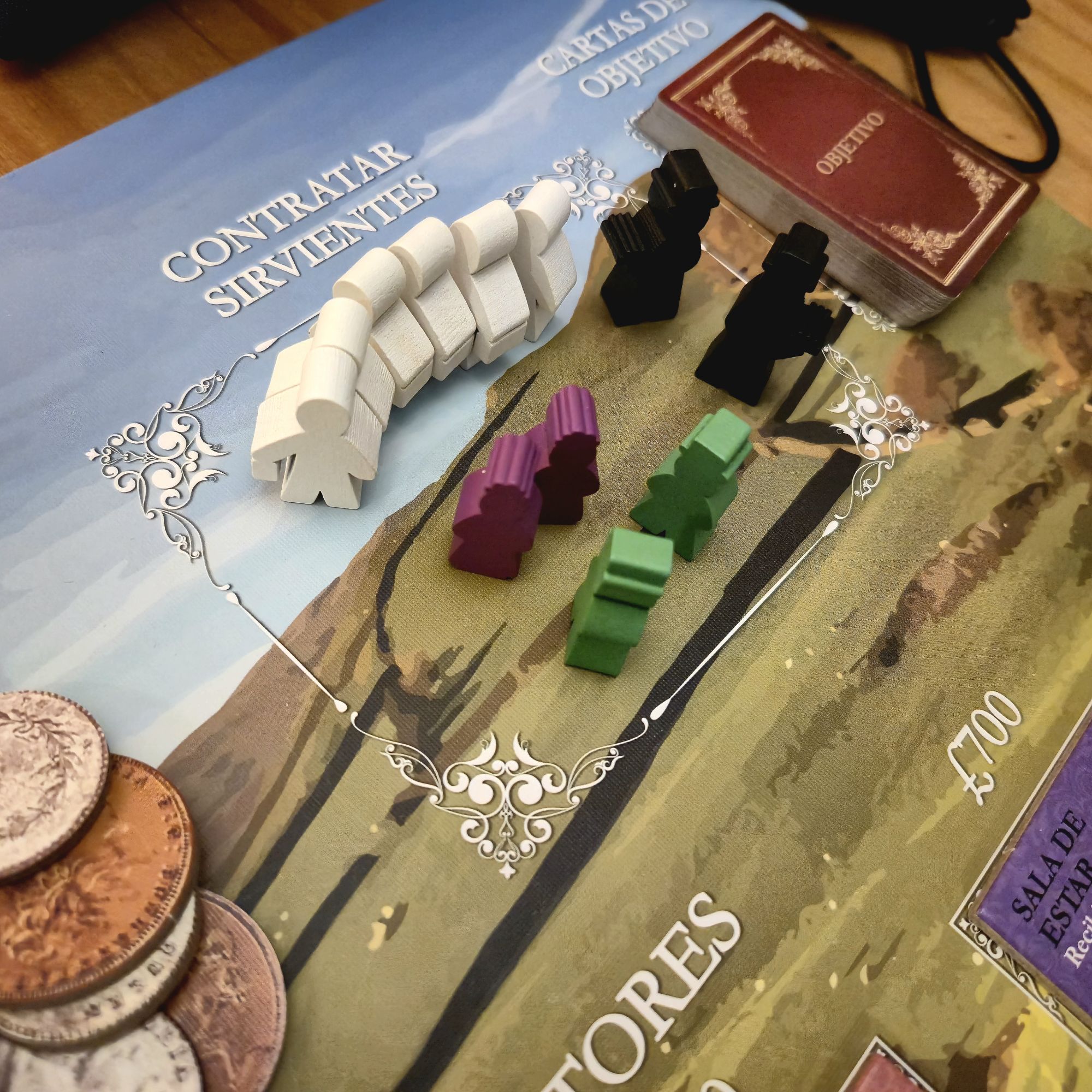 El otro aspecto que nutre la narrativa son las cartas de personaje. Cada una es distinta y, si bien desde el punto de vista mecánico solo nos interesa qué atributos modifica, los pequeños textos le dan una personalidad que se mantiene firme durante la partida. No es lo mismo recibir en nuestra hacienda al señor Charles Hobart, que tiene excelentes contactos pero una madre actriz, que al acaudalado vizconde Walmy, considerado un mujeriego incorregible.